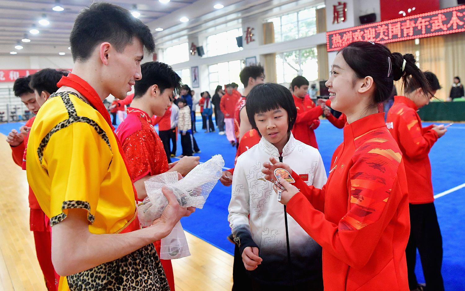 美国青年(左一)在活动上与福建省武术运动管理中心的运动员交流并互赠礼物。