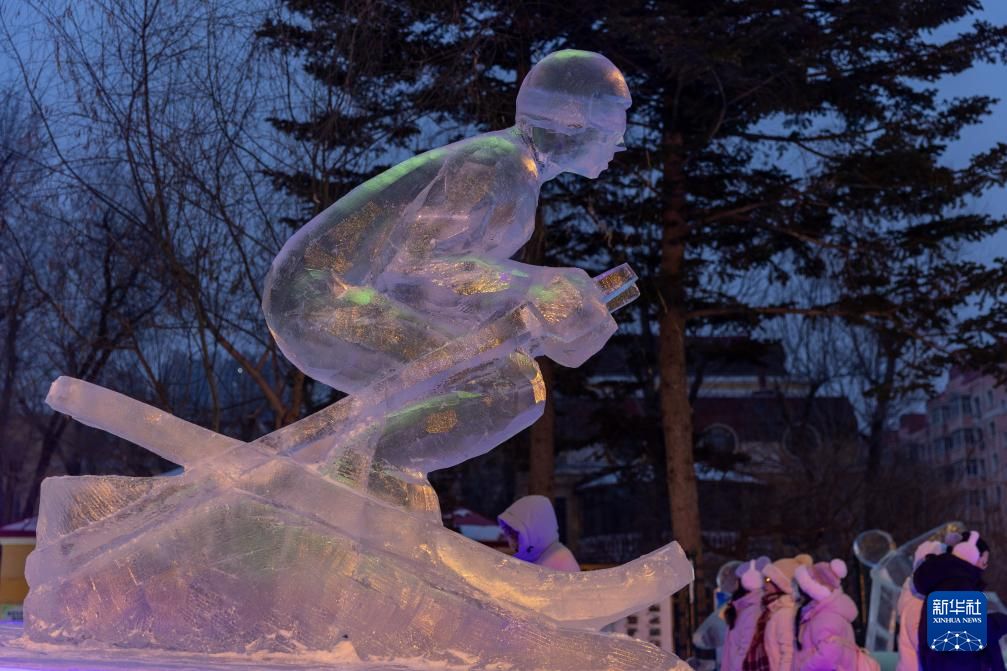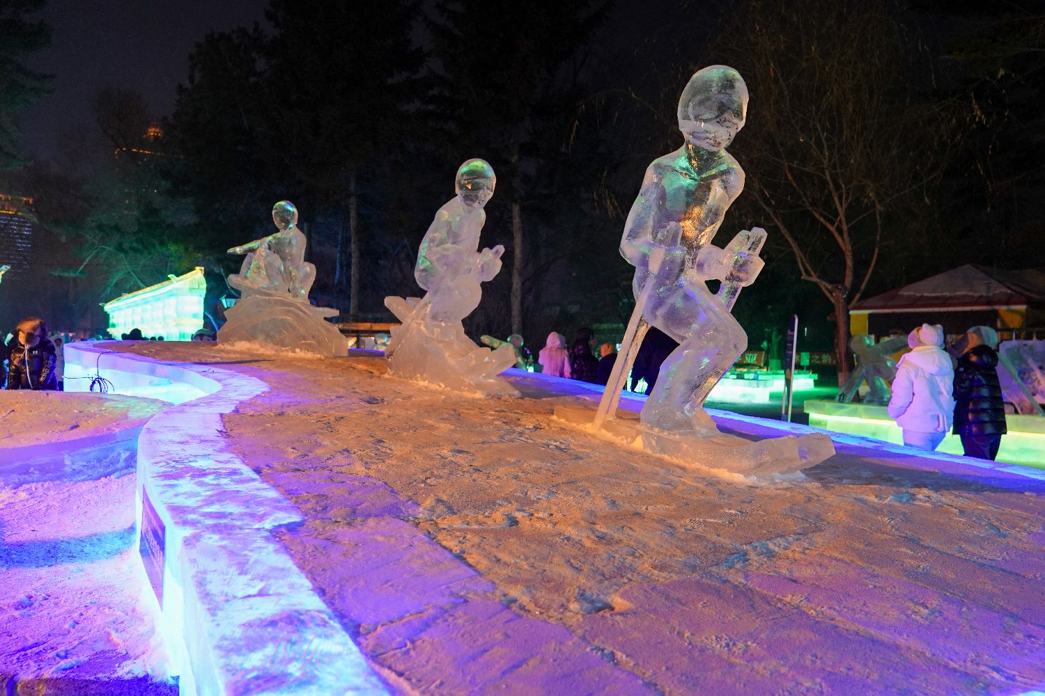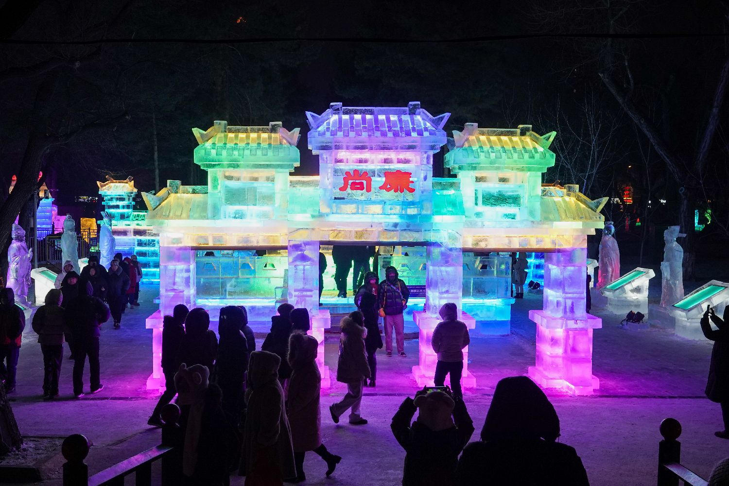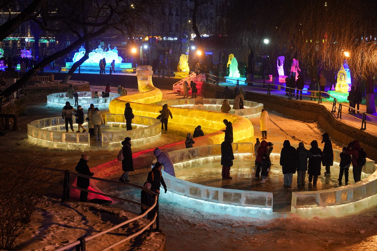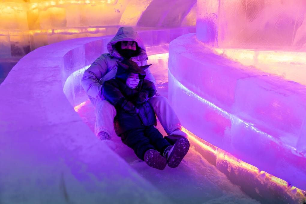 人们在第51届冰灯艺术游园会滑滑梯。(图片来源:新华社)