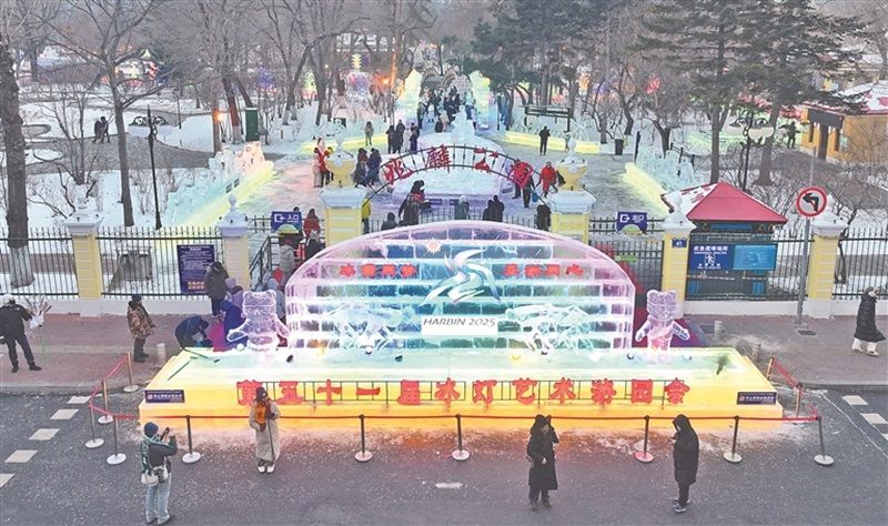 第51届冰灯艺术游园会在哈尔滨市兆麟公园开园。图为入口处。(图片来源:《黑龙江日报》)