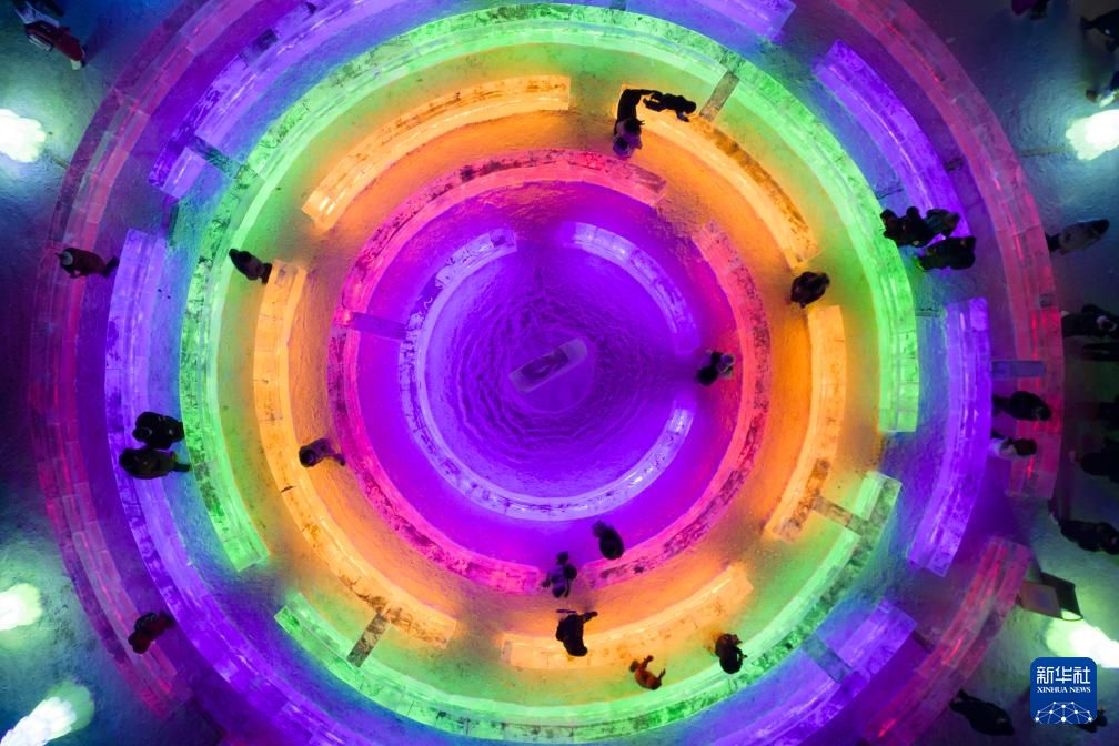 人们在第51届冰灯艺术游园会现场游玩(无人机照片)。(图片来源:新华社)