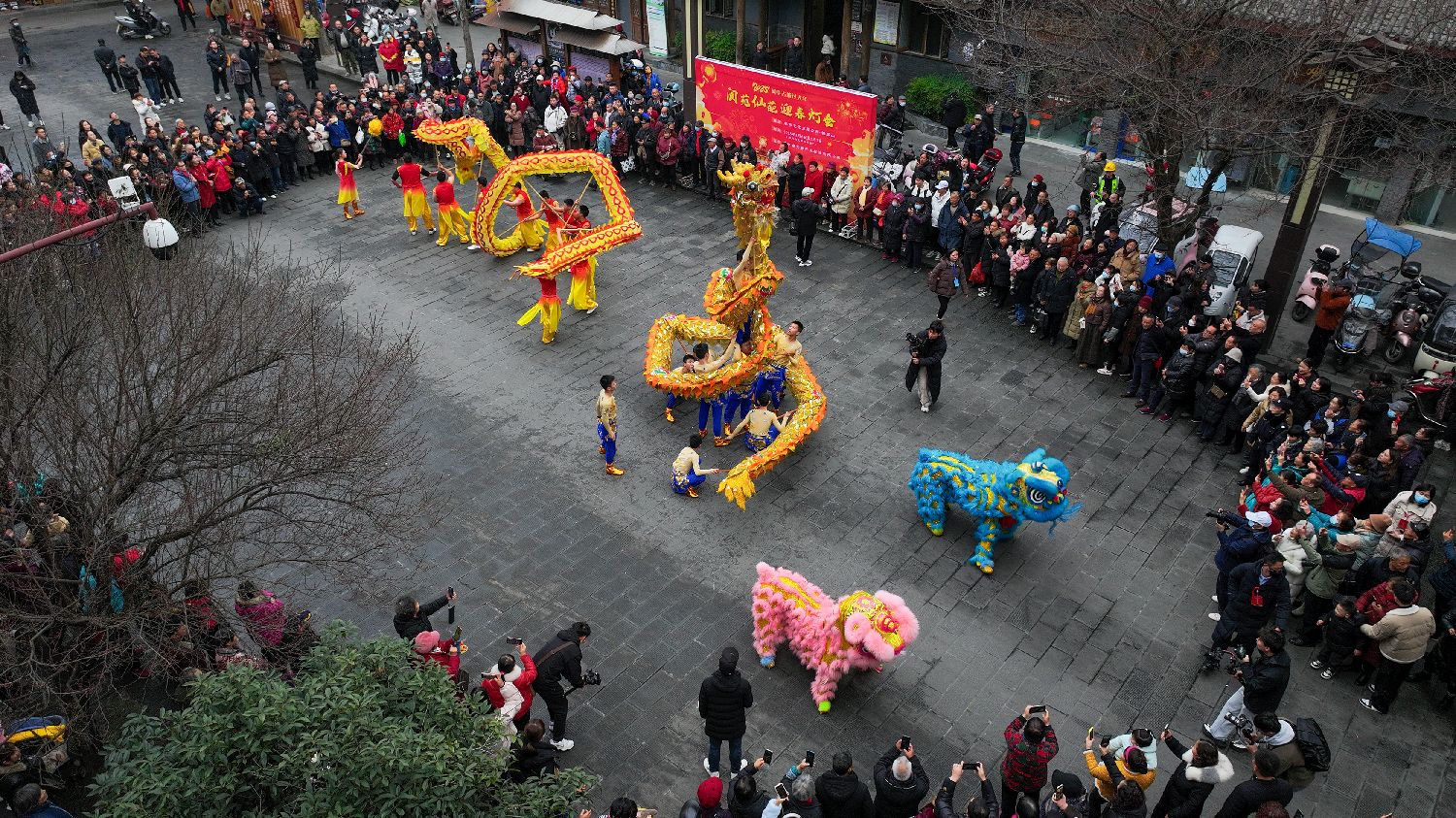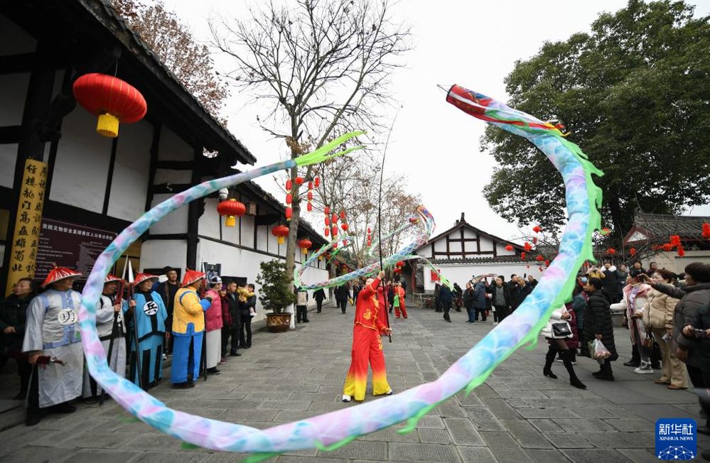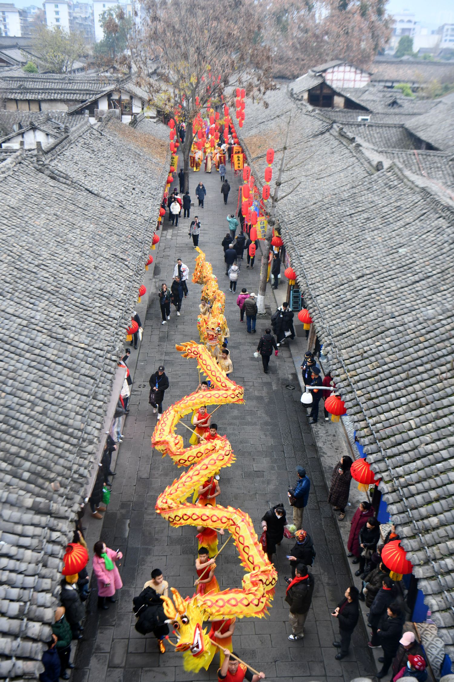 四川阆中古城里的舞龙表演。(图片来源:中新社)