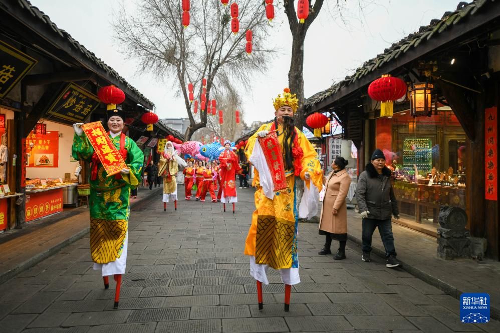 非遗展示展演及民俗队伍巡游等多项传统活动在古城内上演。图为古城里的踩高跷巡游。(图片来源:中新社)