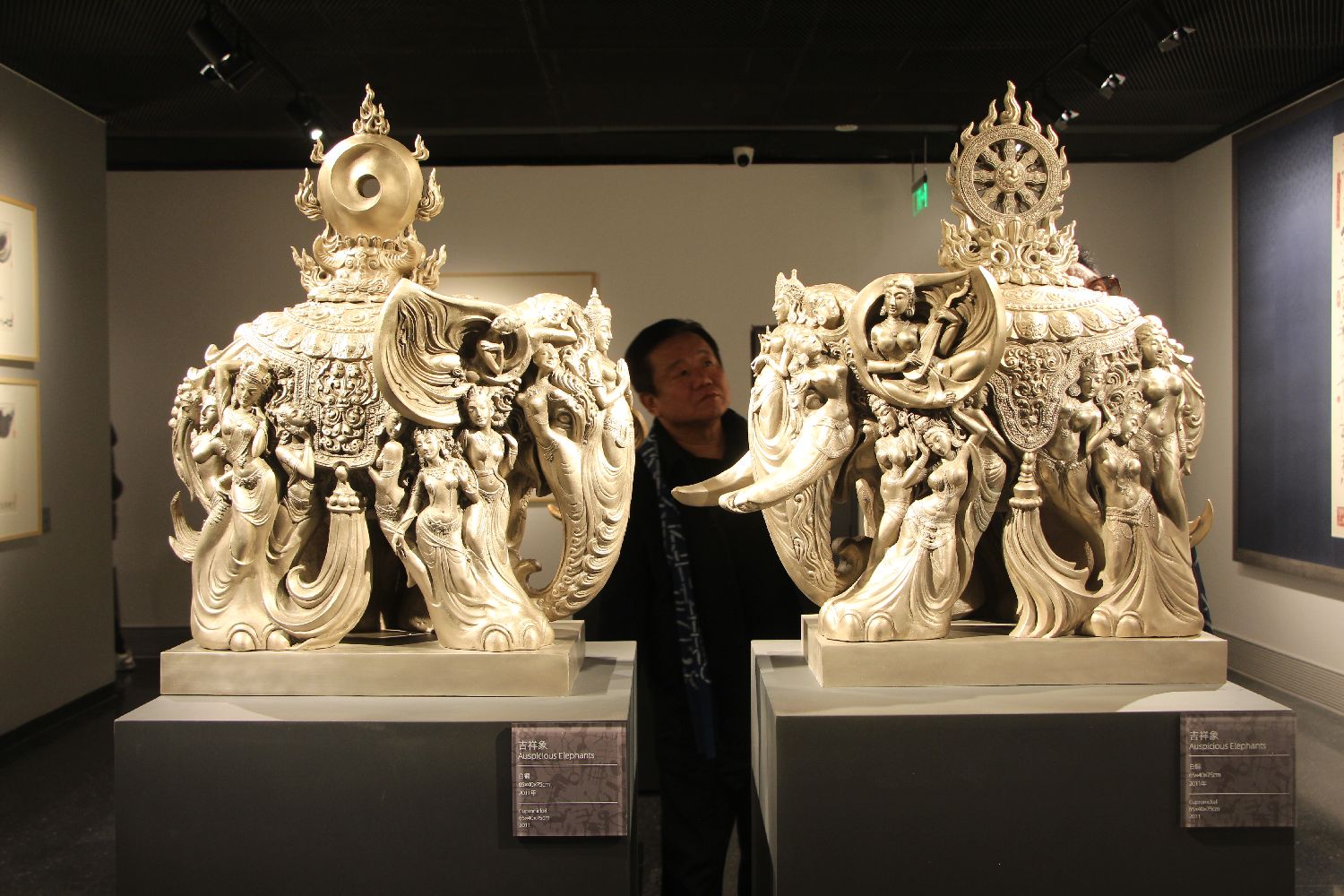 馆内艺术品涵盖了从书法、绘画、雕塑到铁艺、陶瓷、紫砂、印染等不同艺术门类,从视觉艺术到设计艺术、公共美术、城市景观等各个领域。图为观众9日在展厅欣赏白铜作品“吉祥象”。(图片来源:中新社)