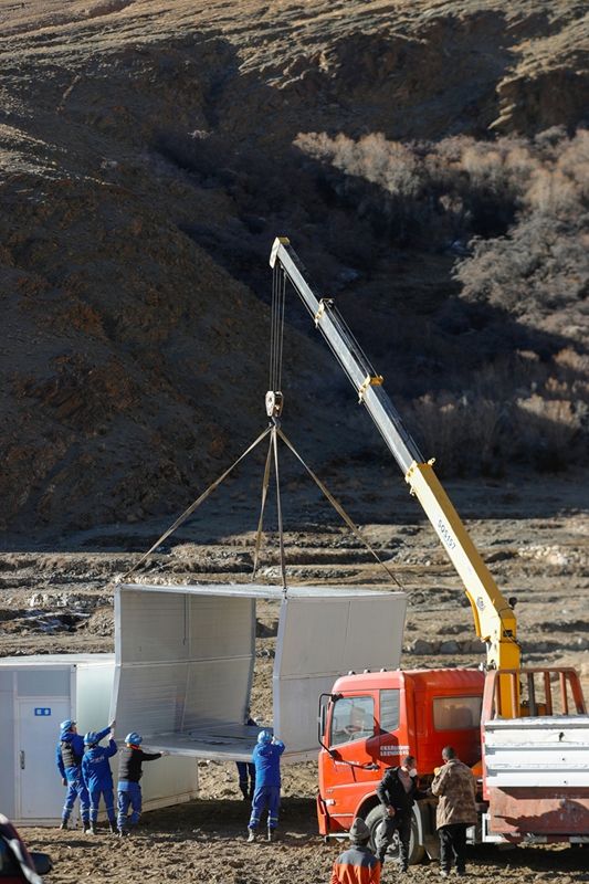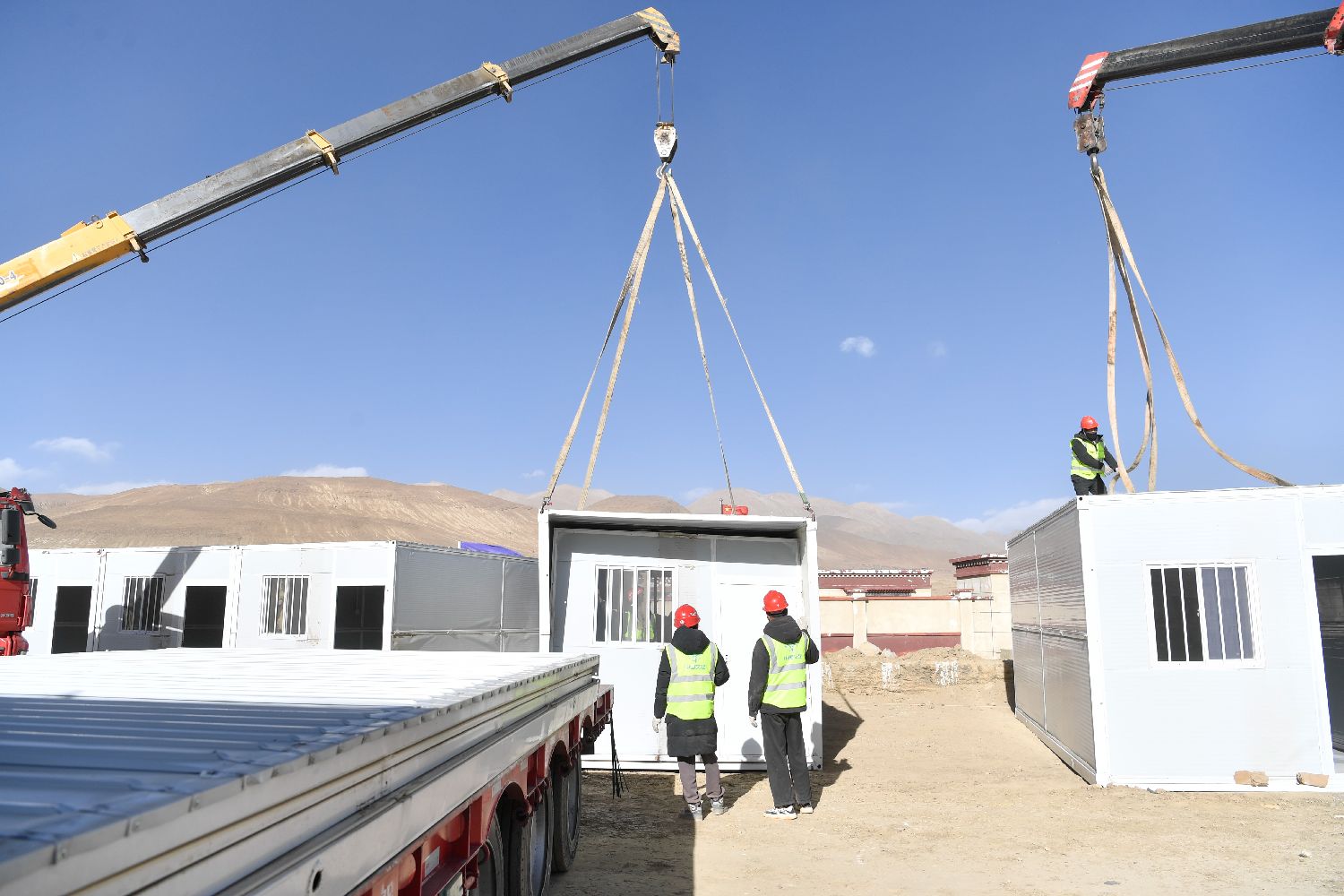西藏自治区定日县曲洛乡措昂村安置点,爱心企业9日为民众搭建活动板房。(图片来源:中新社)