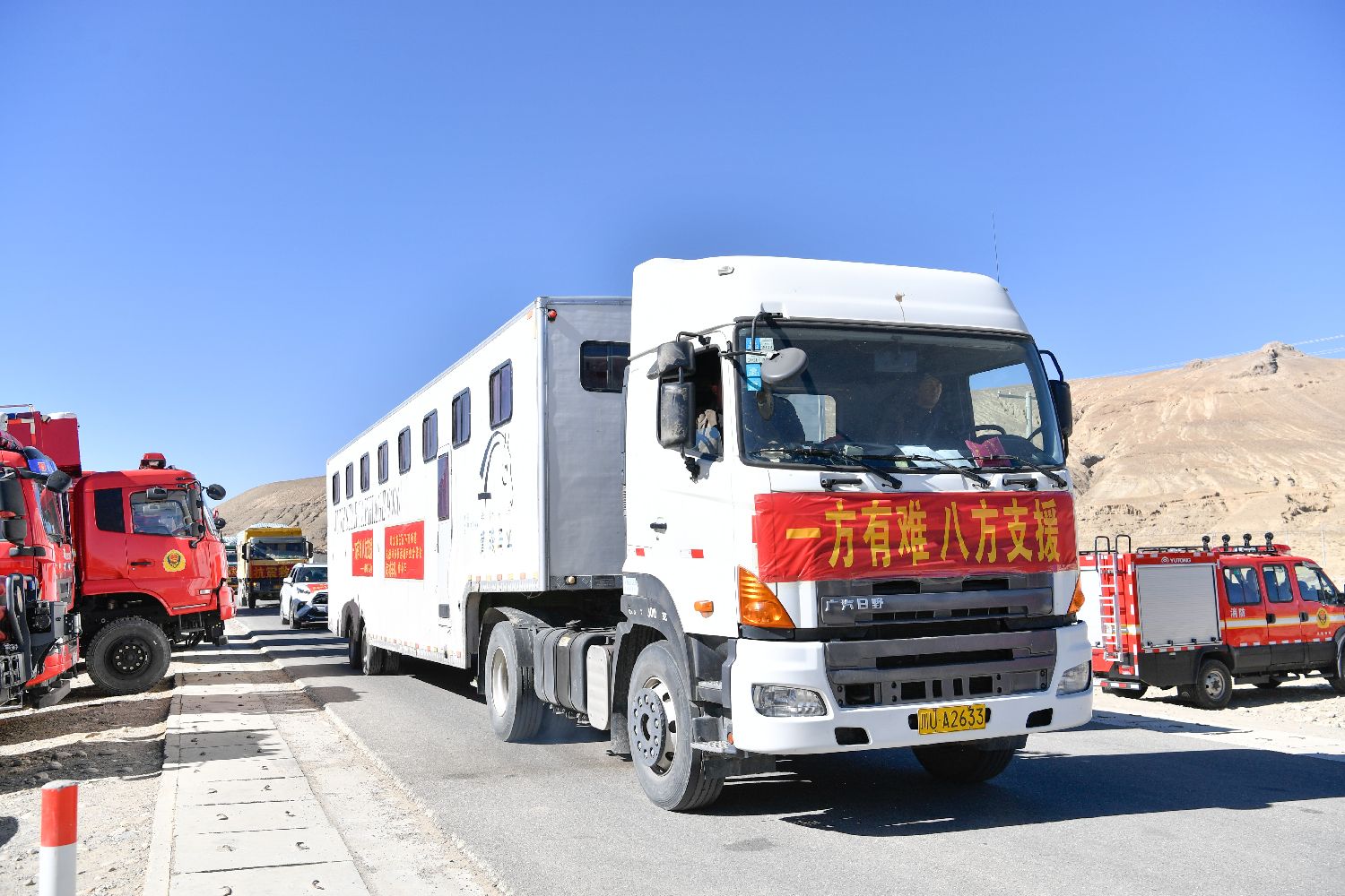 西藏自治区定日县曲洛乡措昂村,满载救灾物资的货车9日抵达安置点。(图片来源:中新社)