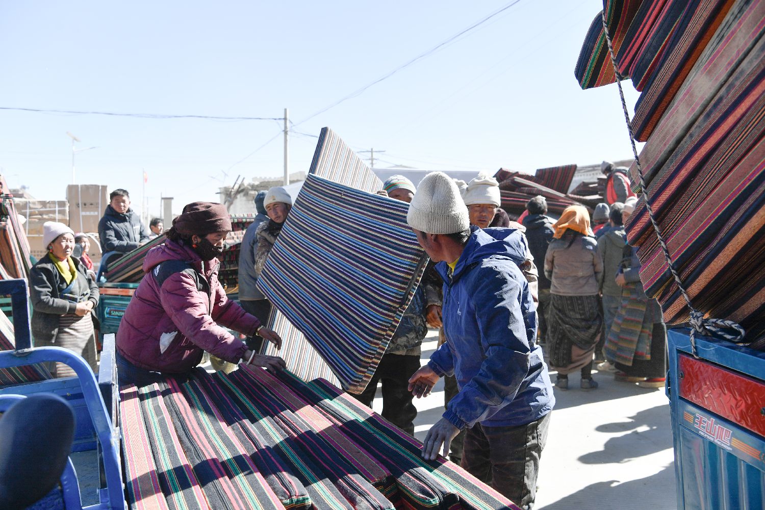 西藏自治区定日县曲洛乡措昂村安置点,受灾民众9日领取床垫。(图片来源:中新社)
