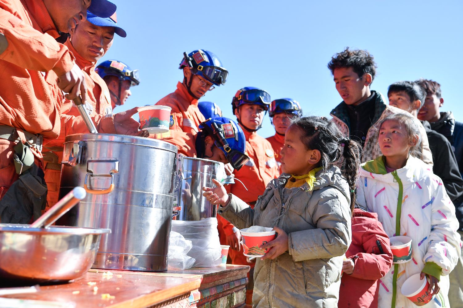西藏自治区定日县曲洛乡措昂村安置点,西藏自治区森林消防总队救援人员9日为受灾民众提供饮食。(图片来源:中新社)