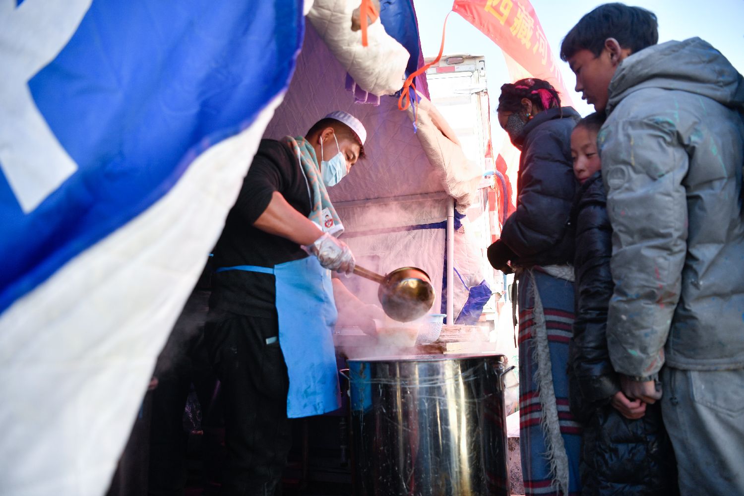 西藏自治区日喀则市定日县长所乡强嘎村,爱心企业8日为受灾民众提供热气腾腾的牛肉面。1月7日9时5分,西藏自治区日喀则市定日县发生6.8级地震,震源深度10公里。图为爱心企业为受灾民众提供免费牛肉面。(图片来源:中新社)