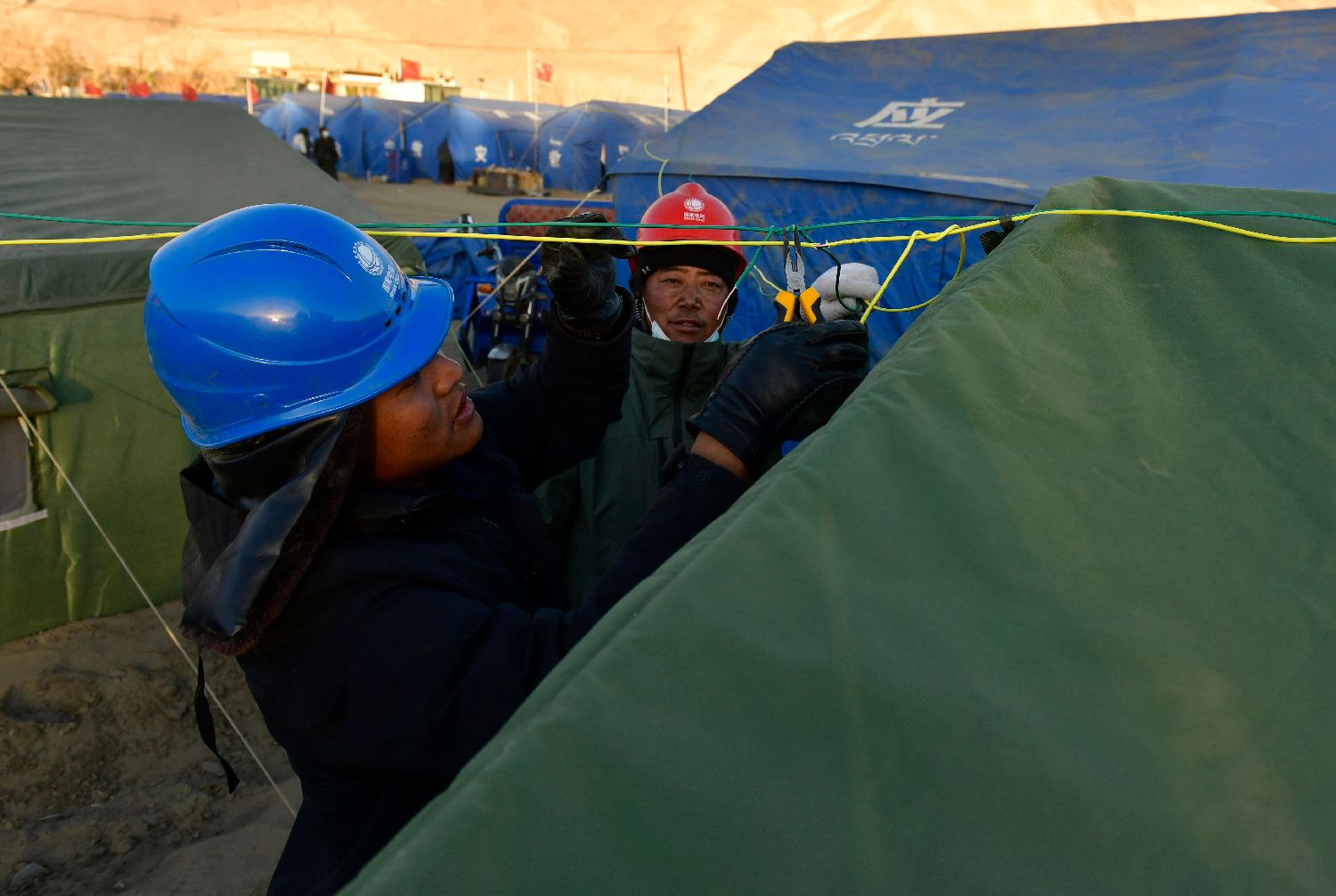 工作人员9日正在定日县长所乡森嘎村安置点架设电线保障帐篷内照明。(图片来源:中新社)
