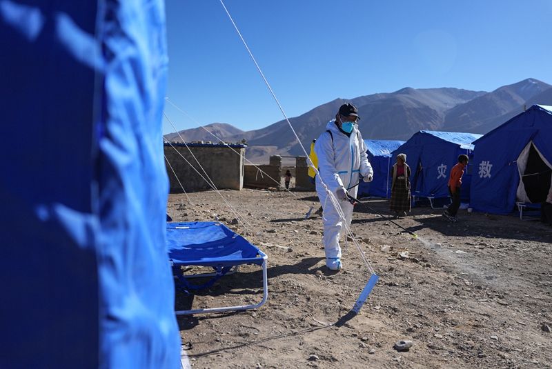 医护人员8日在日喀则市定日县措果乡野江村进行消杀。(图片来源:新华社)