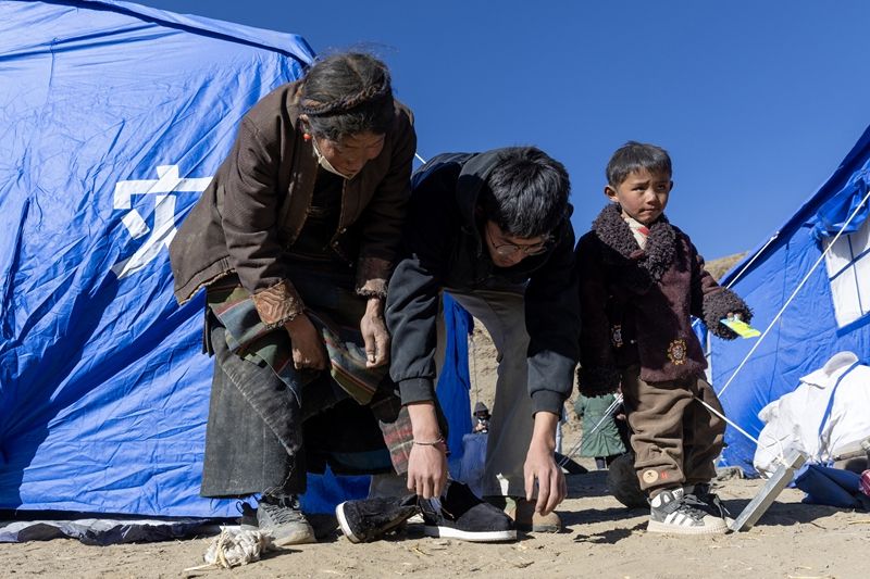 在日喀则市定日县长所乡古荣村安置点,一名大学生志愿者(左二)8日帮助受灾民众换上保暖的新鞋。(图片来源:新华社)