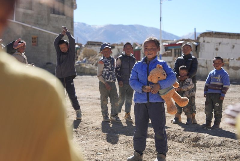 在日喀则市定日县措果乡塘仁村地震灾后安置点,西藏星光社会工作服务中心社工8日向孩子们赠送玩偶熊,并给他们表演节目。(图片来源:新华社)