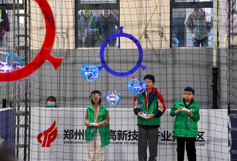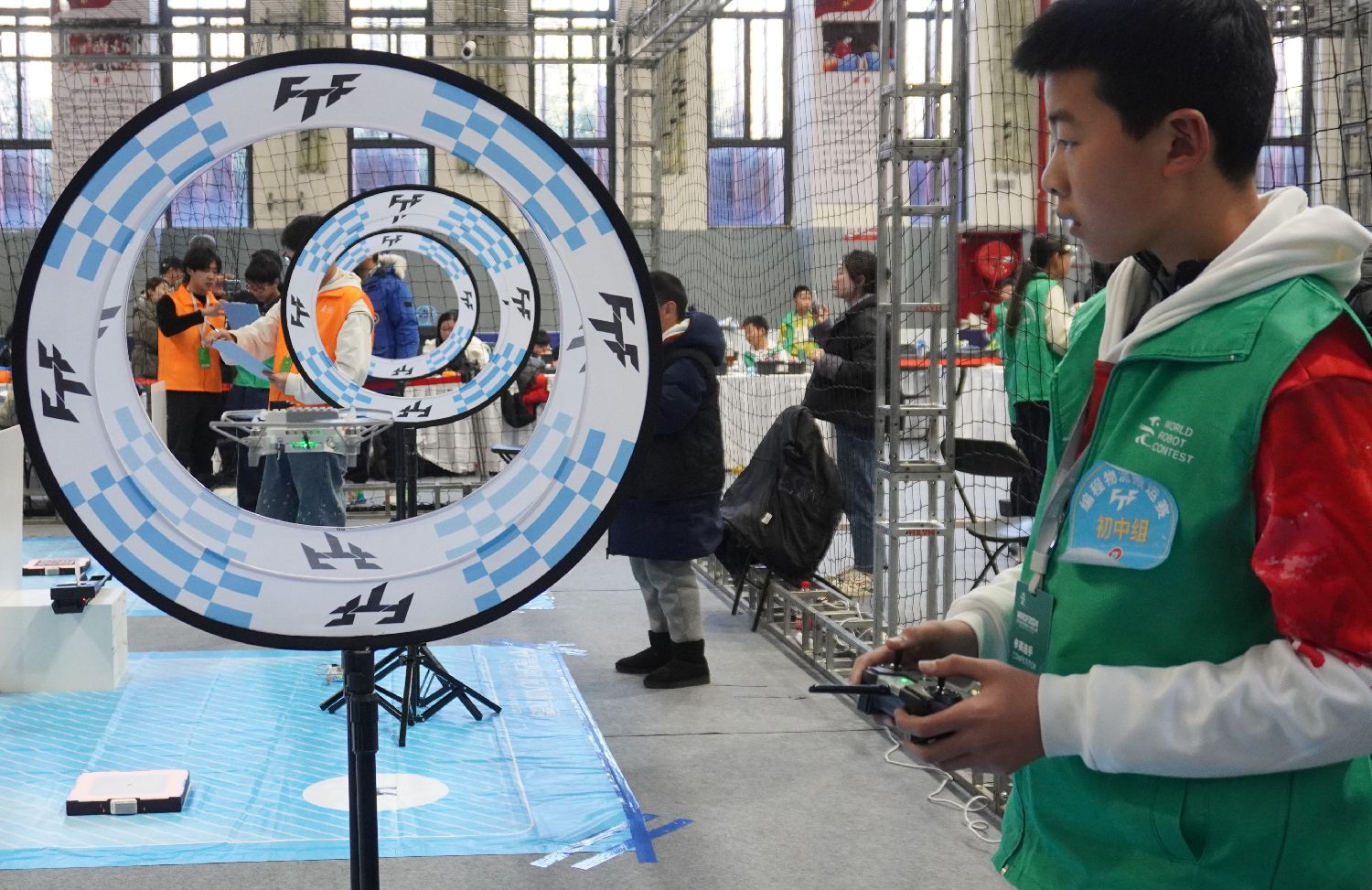 参赛选手操控无人机角逐“编程物流搬运”赛项。(图片来源:中新社)