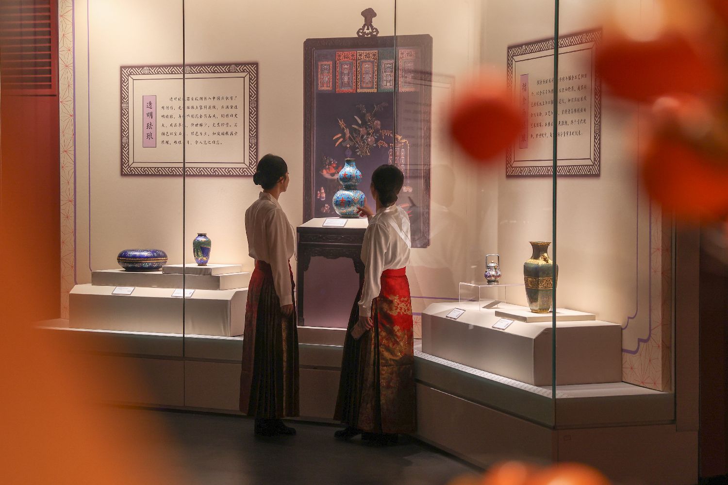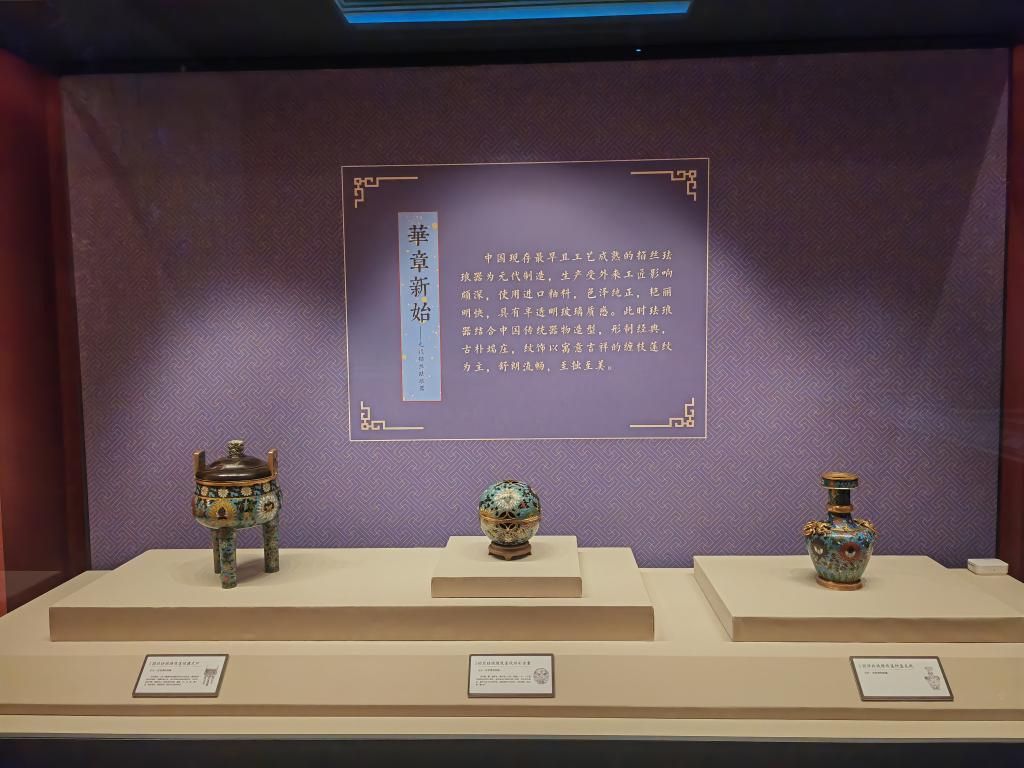此次“故宫厅”开厅首展“瑞彩熠熠——故宫博物院藏宫廷珐琅器精品展”展出74件元、明、清三朝宫廷至精至美的珐琅器。(图片来源:大陆央视新闻客户端)