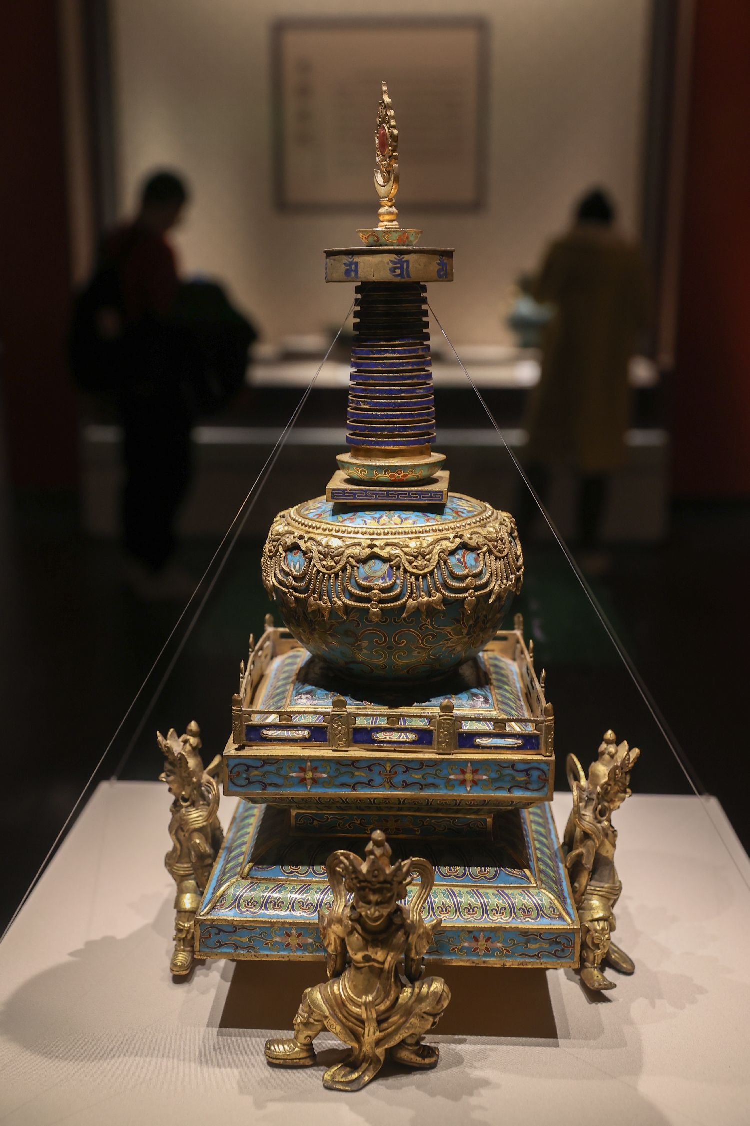 中国现存最早且工艺成熟的掐丝珐琅器为元代制造,故宫博物院藏品共12件,这次有3件来了南昌。图为来自清朝乾隆年间的《掐丝珐琅缠枝莲纹佛塔》。(图片来源:中新社)