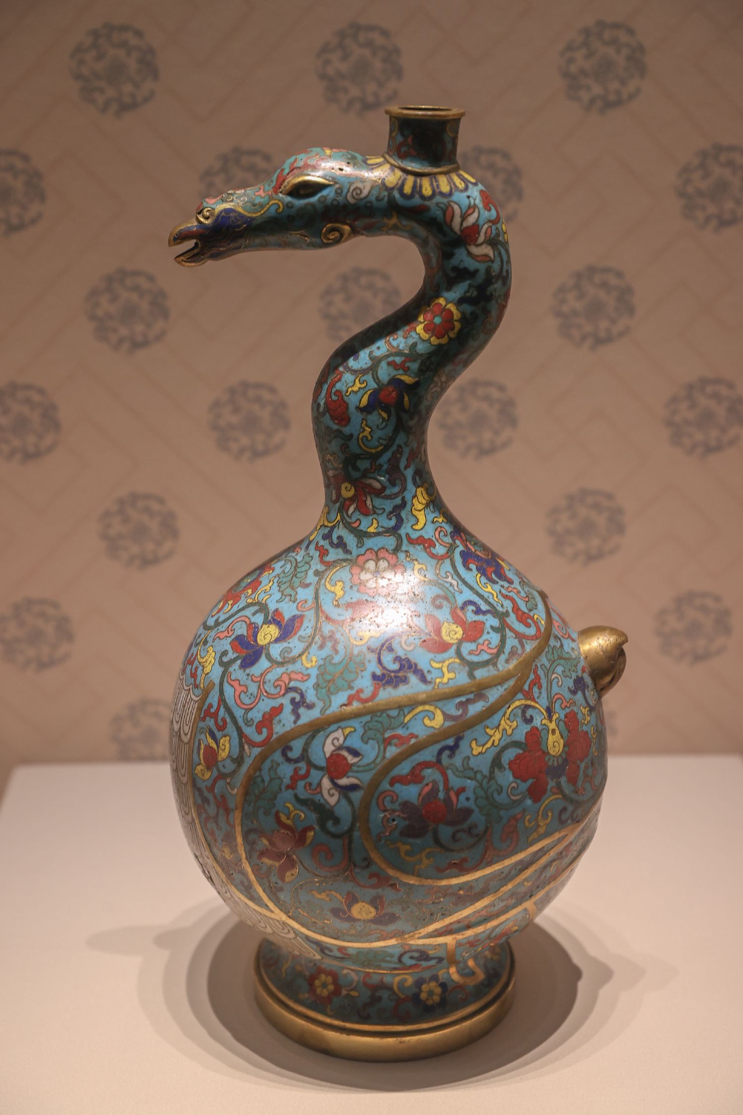 来自清朝乾隆年间的《掐丝珐琅凫式瓶》。(图片来源:中新社)