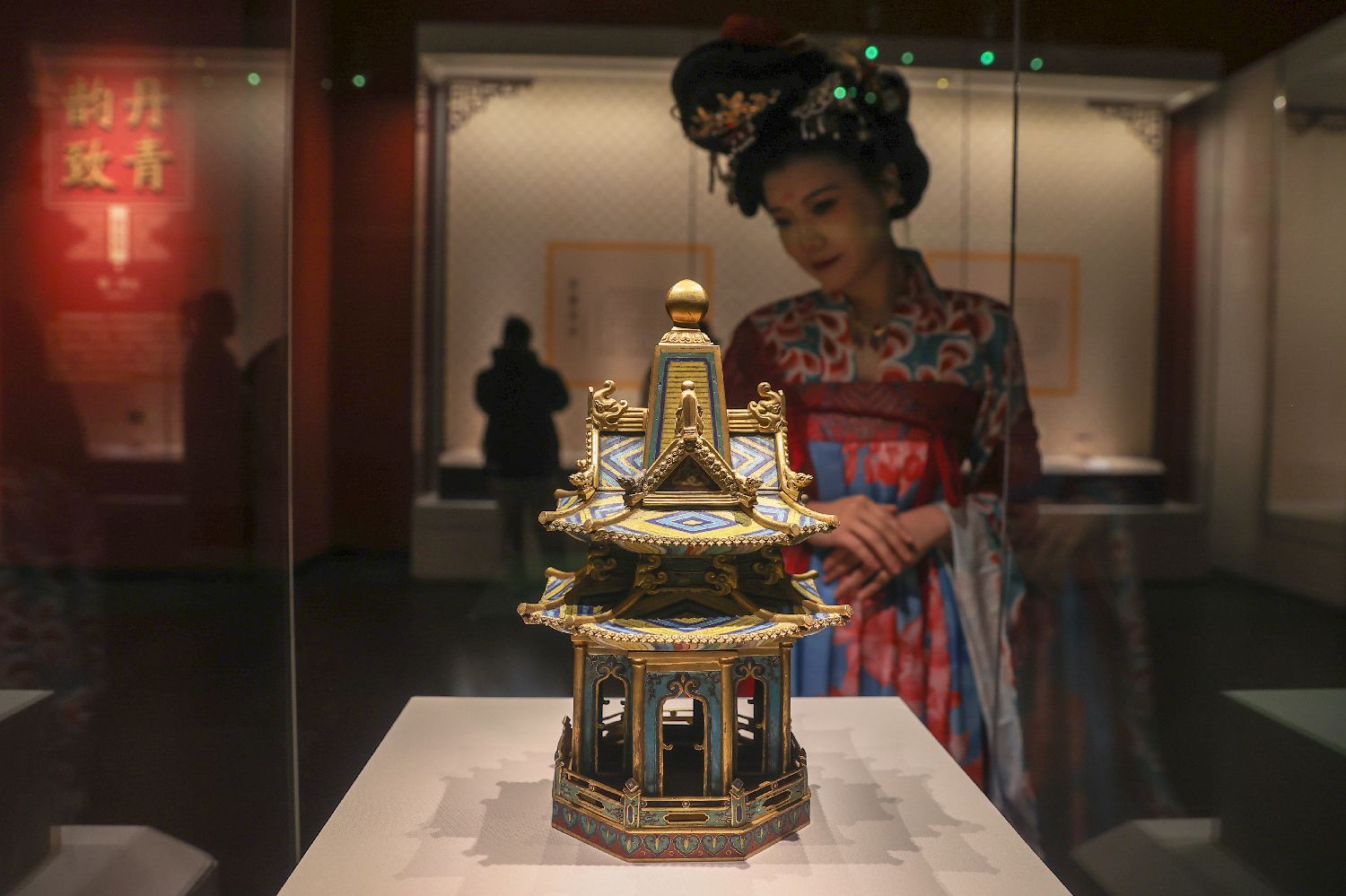 身着古装的观众在观看来自清朝中期的《掐丝珐琅十字亭》。(图片来源:中新社)