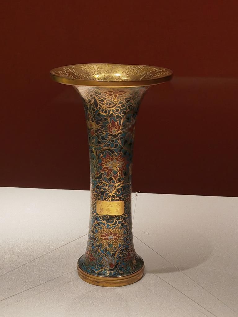 图为首次面向公众展出的掐丝珐琅缠枝莲纹花觚。(图片来源:新华社)