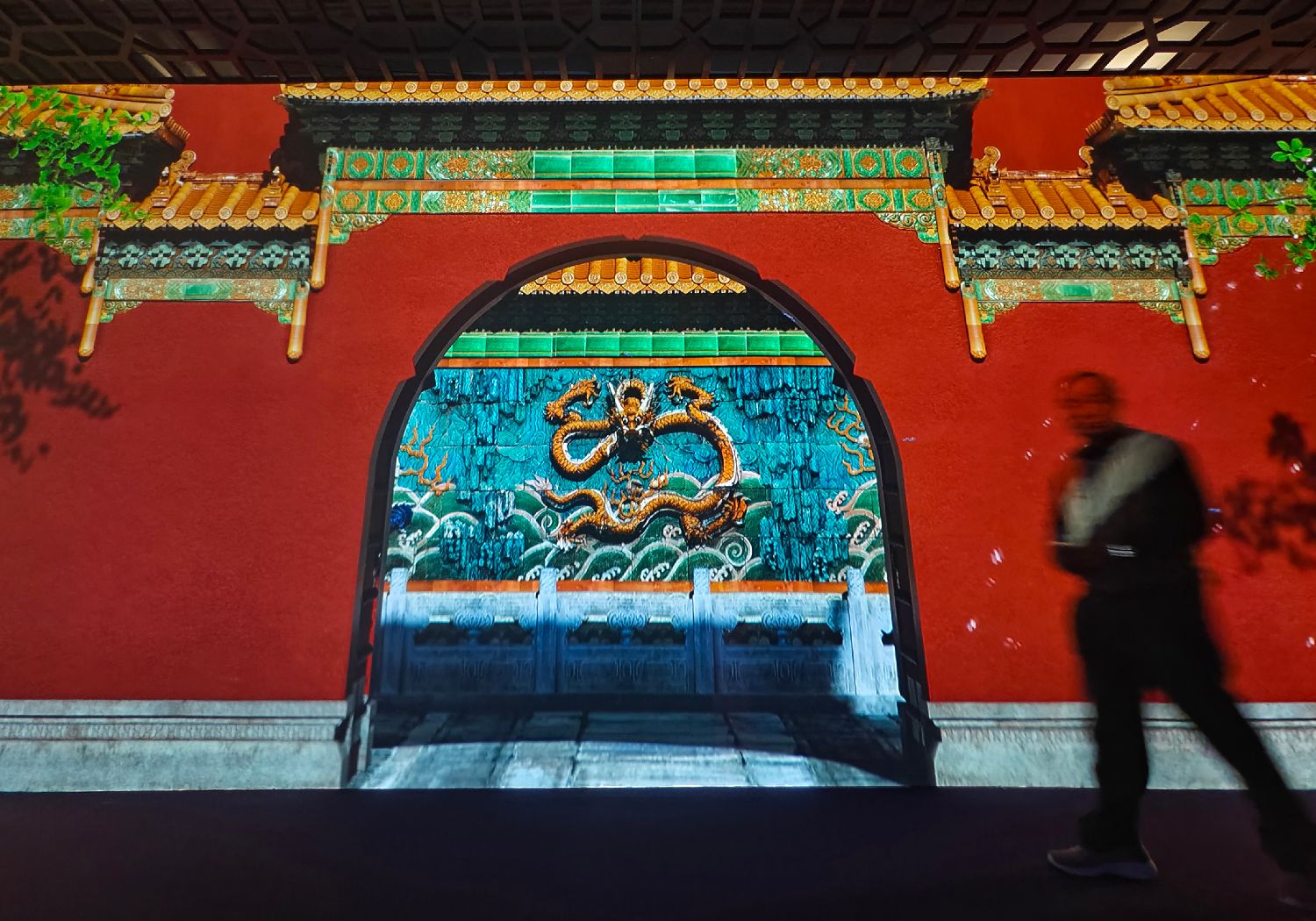 一位观众经过以数字动态方式呈现的故宫博物院内的皇极门。