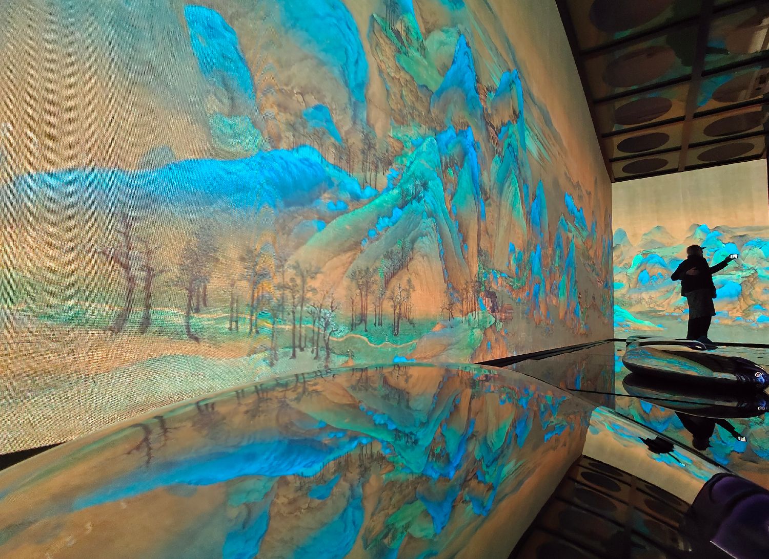 观众在大屏幕呈现的故宫博物院馆藏王希孟《千里江山图》卷前自拍留念。