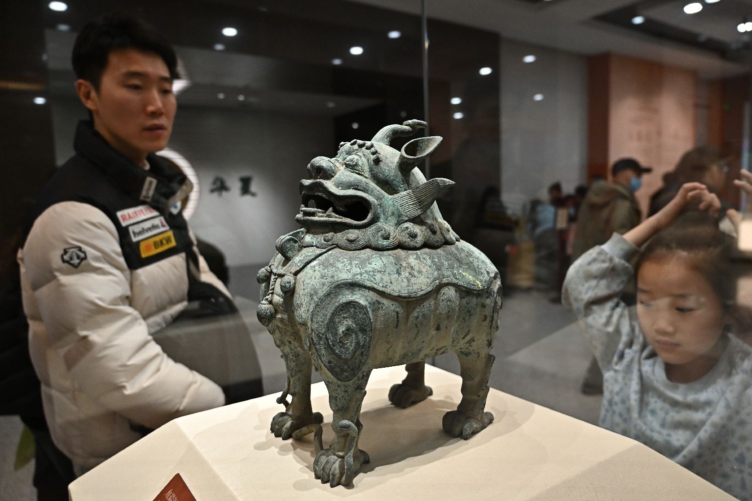 甪端铜熏炉。“甪端”是中国古代神话传说中的一种神兽,与麒麟相似,但有一角,脚下常踏一蛇,象征好生恶杀。(图片来源:中新社)