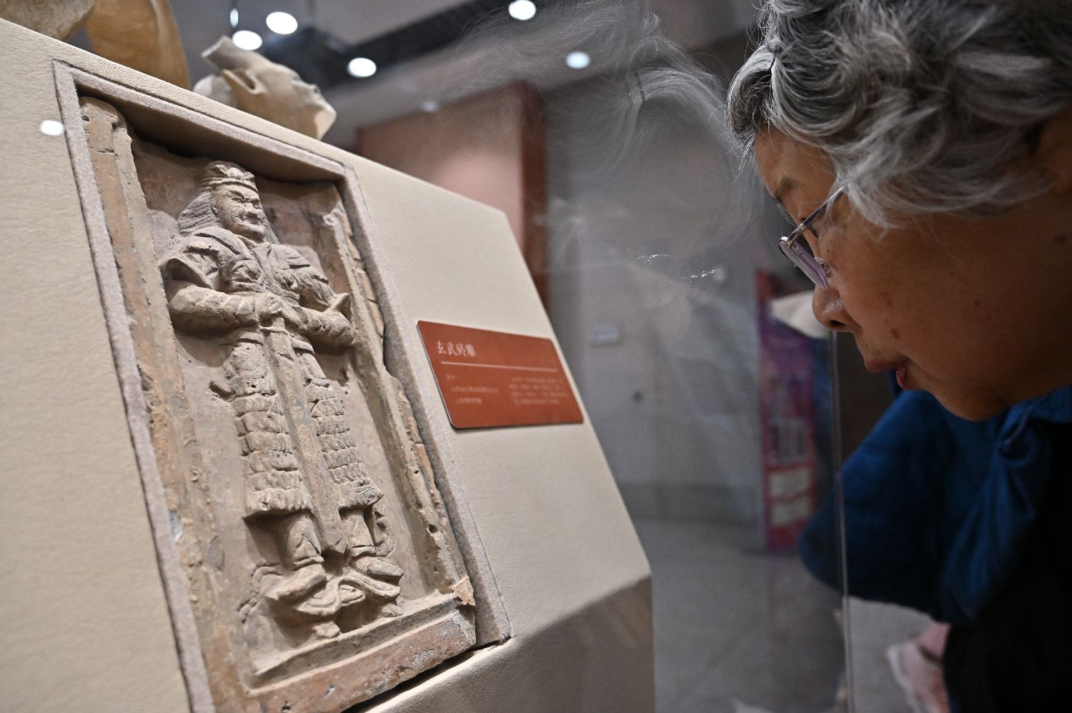 宋代玄武砖雕。这件文物中的玄武神像长发披肩,面目狰行,穿盔甲,手握宝剑,脚踩一大龟身上,脚后有条蛇。(图片来源:中新社)