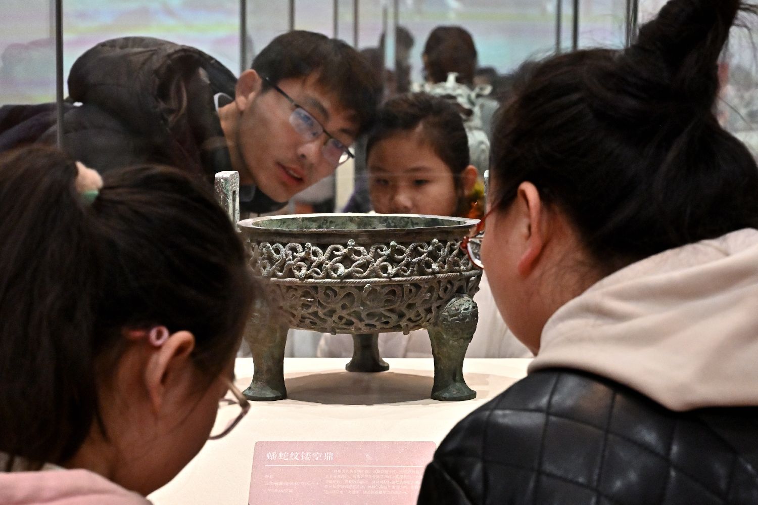 蟠蛇纹镂空鼎。鼎腹外层是在鼎颈和底之间附加的,为镂空蟠蛇纹,表现为头高昂、身体缠绕似游动的群蛇形象。(图片来源:中新社)