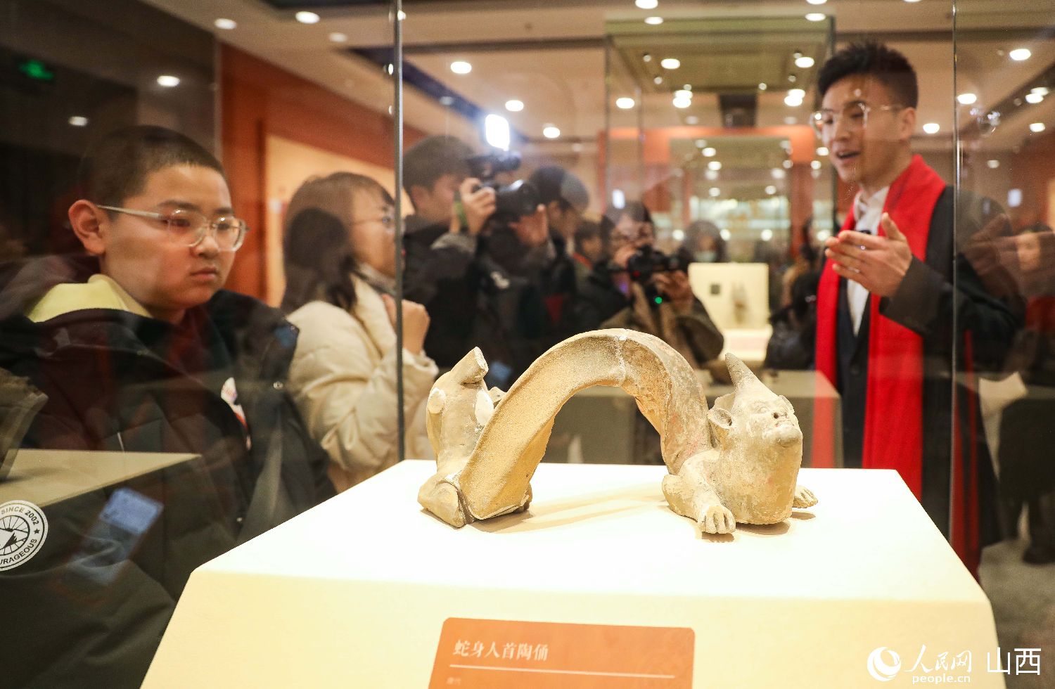 展览通过龙蛇、金蛇、铸蛇、玉虬、画蛇、神蛇、巳蛇、灵蛇等八个板块,对藏于山西博物院的蛇形文物进行全面展示。展览展出从商代到明代的蛇文物8件,其中6件首次亮相。图为蛇身人首陶俑。(图片来源:北京人民网)