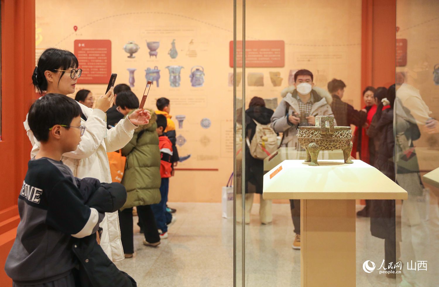 观众仔细欣赏文物身上的蛇元素。(图片来源:北京央广网/山西省博物院供图)