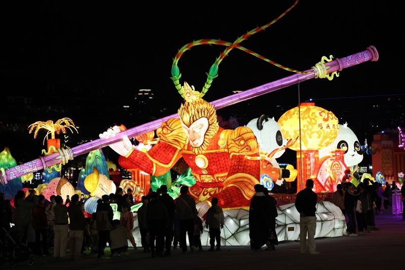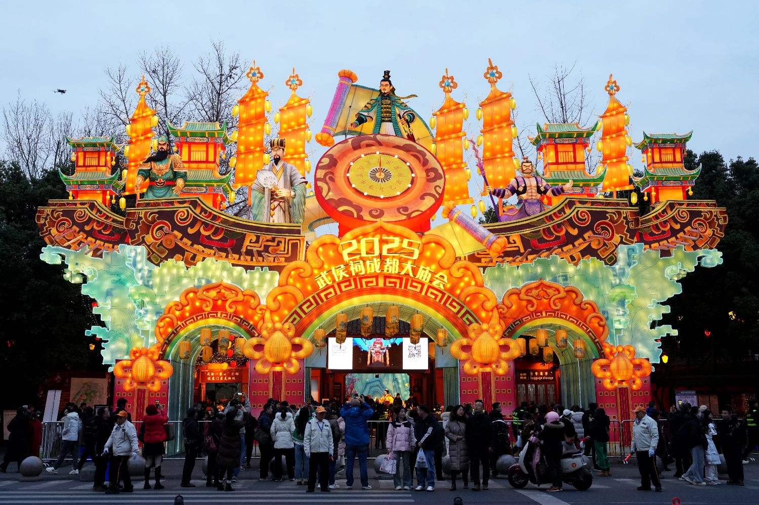 2025武侯祠成都大庙会在成都武侯祠博物馆开庙,大庙会汇集主题灯展、精品展览、文艺演出、仿古祭祀、游喜神方、创意集市等一系列具有“民俗新年景”的文旅活动,让民众欢欢喜喜过大年。图为大庙会大门灯组。(图片来源:中新社)