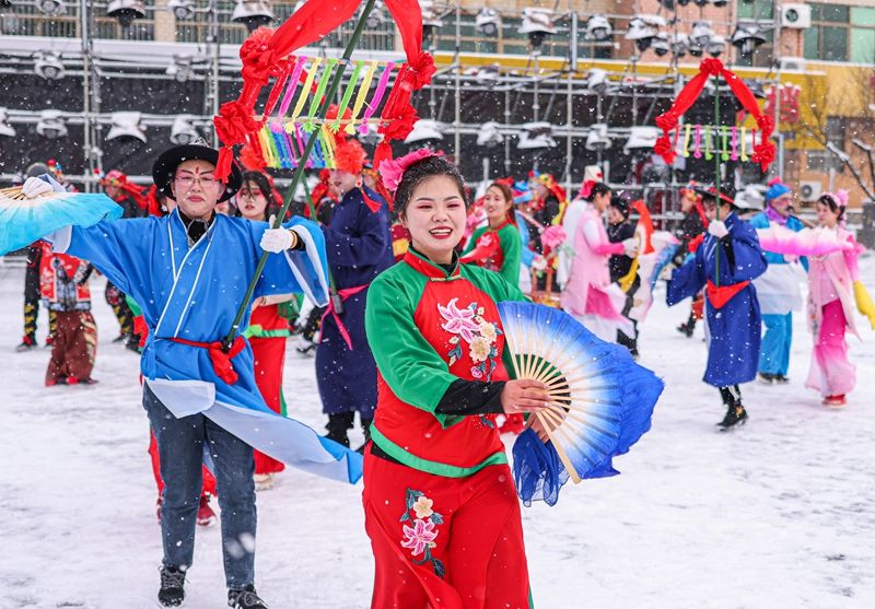 在山东省荣成市寻山街道青鱼滩社区文化活动广场,民间艺人表演渔家秧歌。(图片来源:新华社)