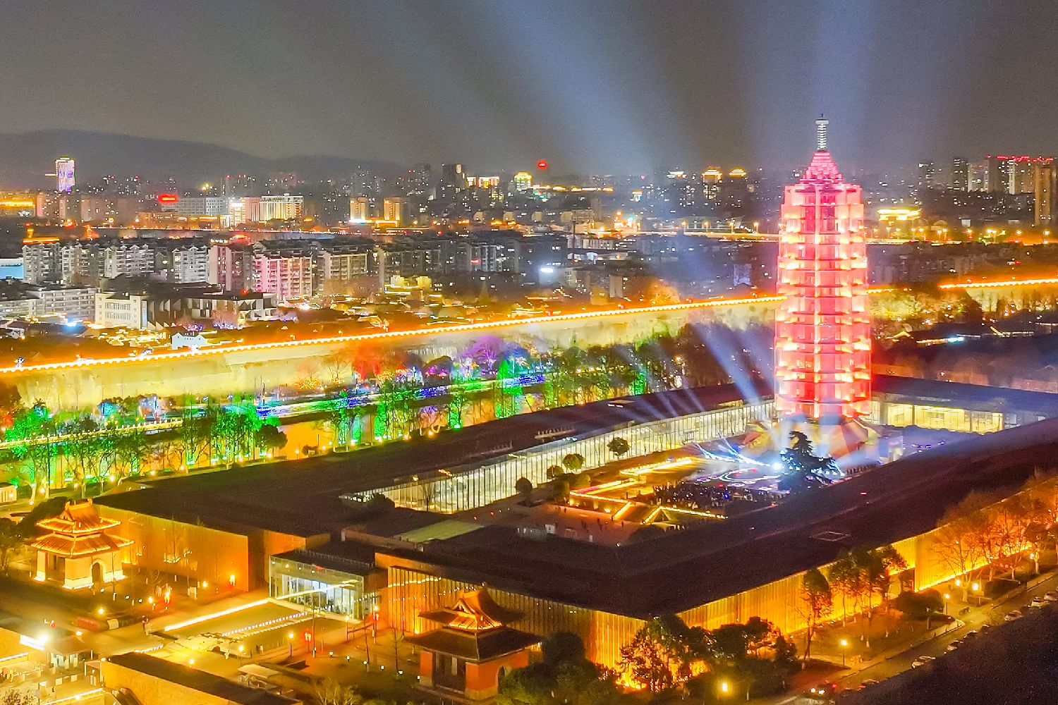 在江苏南京,大报恩寺遗址博物馆大报恩塔28日晚上演璀璨绚丽灯光秀,与历史悠久的秦淮河、六百多岁的明城墙相呼应,光影交织点亮夜空,迎接农历蛇年新春的到来。(无人机照片)(图片来源:中新社)