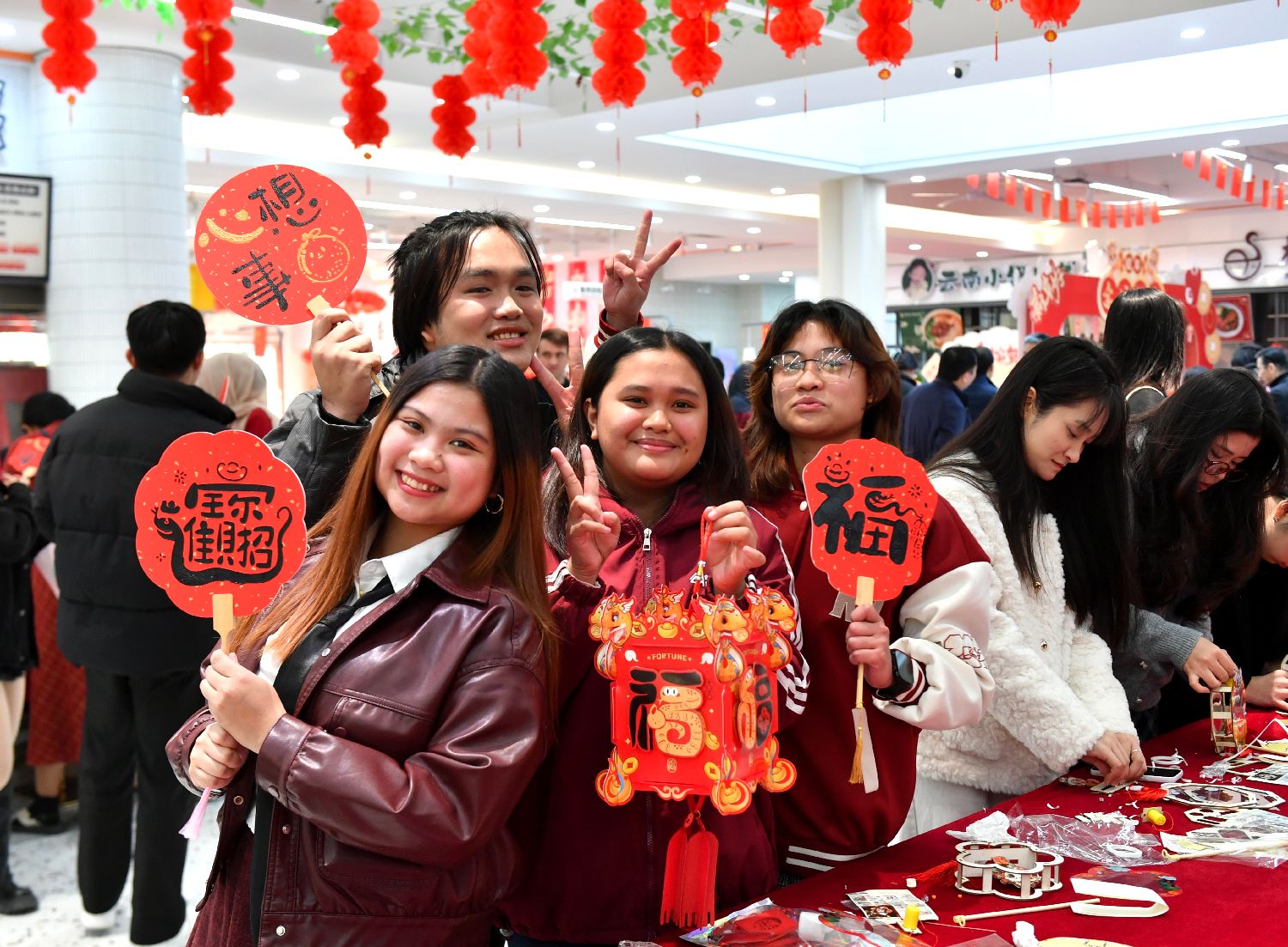 正值农历除夕,来自菲律宾、印度尼西亚、俄罗斯、巴基斯坦等国家的福建师范大学海外教育学院百余名留学生欢聚在福州,与学校老师一同庆祝蛇年春节的到来。图为留学生展示制作好的春节文创饰品。(图片来源:中新社)