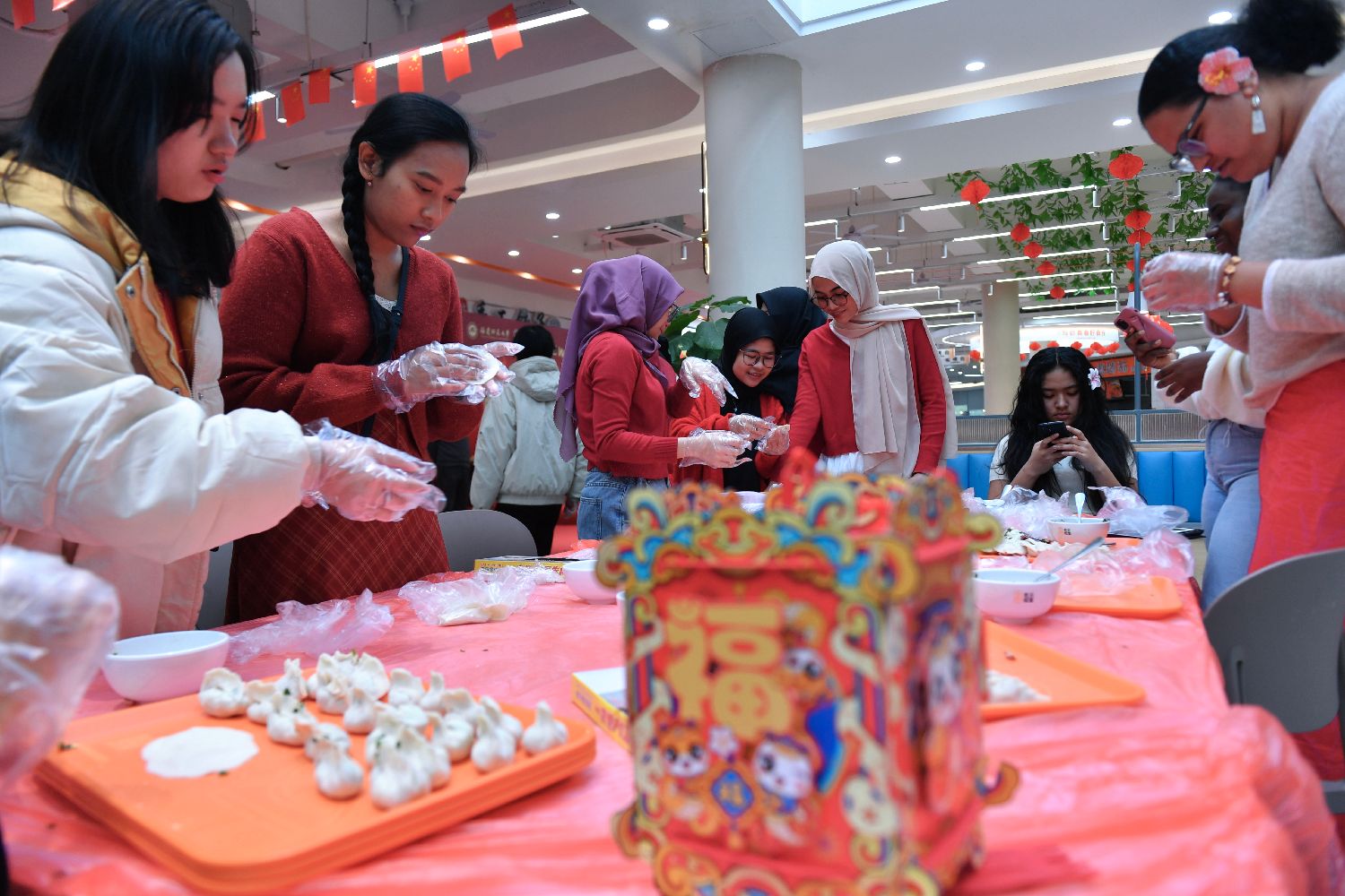 正值农历除夕,来自菲律宾、印度尼西亚、俄罗斯、巴基斯坦等国家的福建师范大学海外教育学院百余名留学生欢聚在福州,与学校老师一同庆祝蛇年春节的到来。图为留学生体验包饺子。(图片来源:中新社)