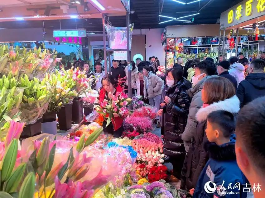 位于长春市绿园区的花卉市场,现场人潮涌动,热闹非凡。图为民众驻足在花卉前进行选购。(图片来源:北京人民网)