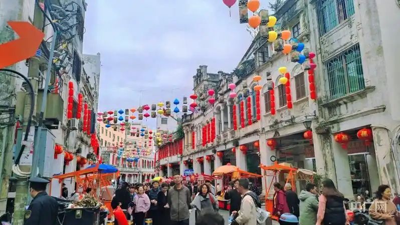 彩色灯笼点缀在海口市博爱南路街道上空,为老街增添活力。(图片来源:北京央广网)