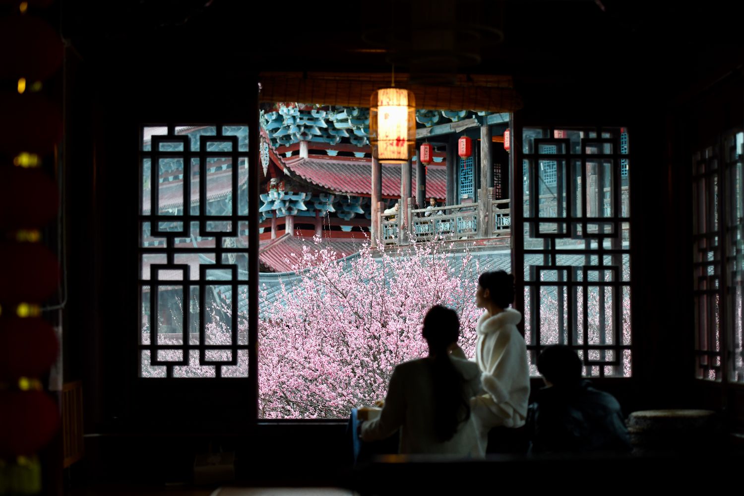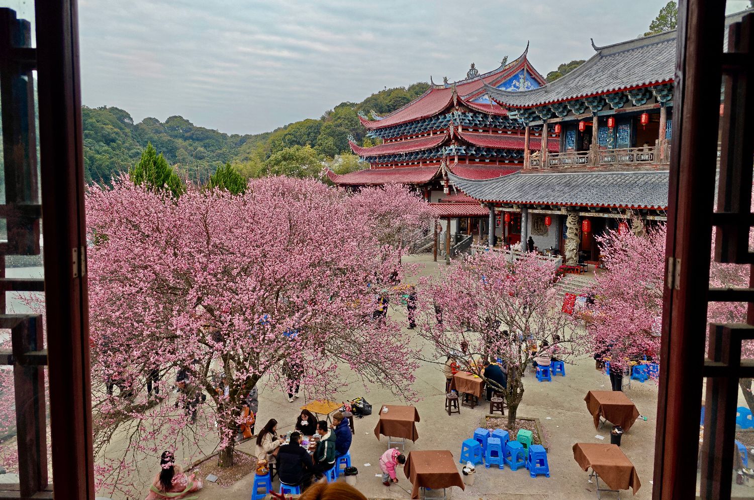 每年冬季,尤其是春节期间,林阳寺的梅花盛开,吸引了大量游客和摄影爱好者前来赏梅。2月5日,林阳寺梅花树吸引游客赏梅、泡茶聊天、留影。