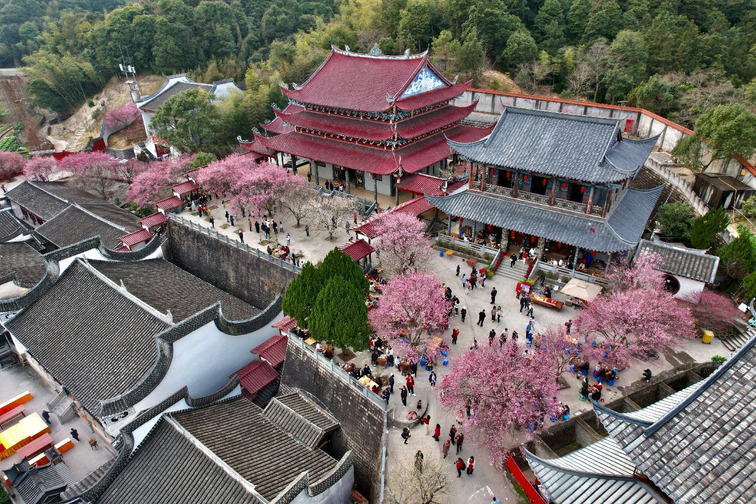 2月5日,福建福州,游客到千年古刹林阳寺赏梅。(无人机照片)