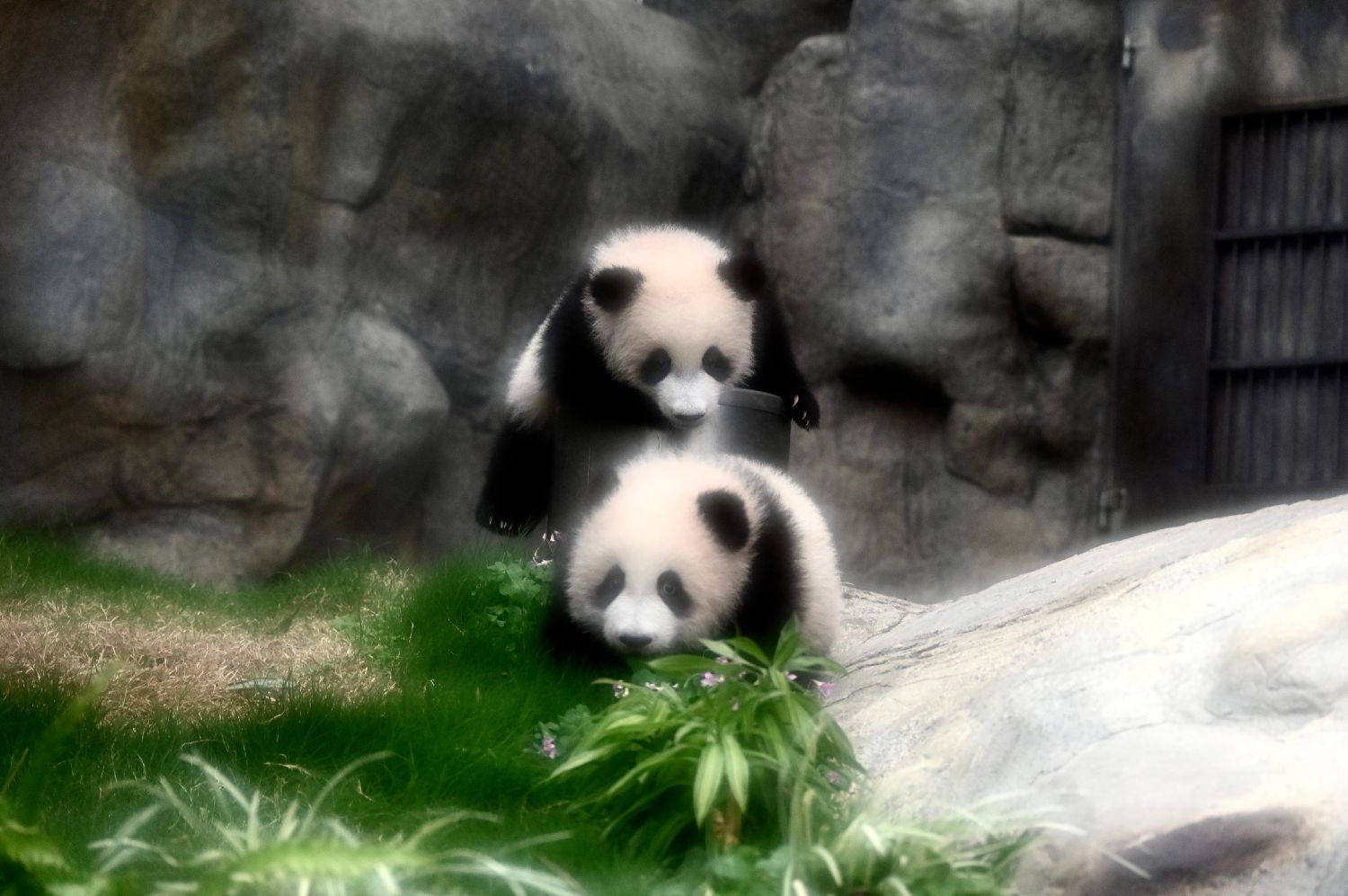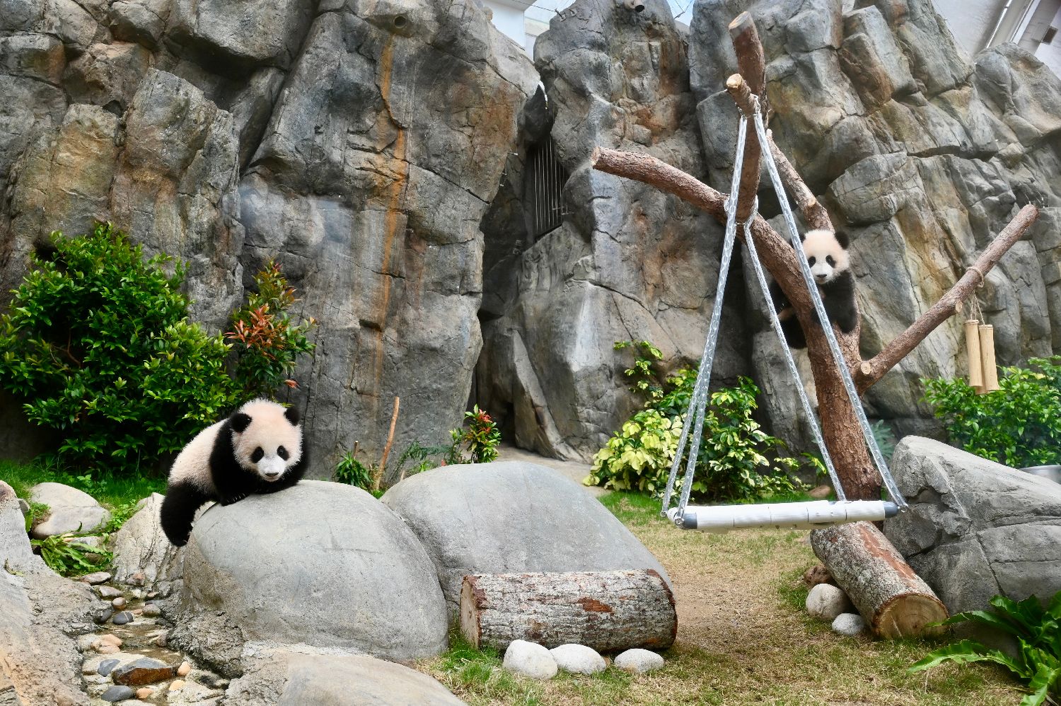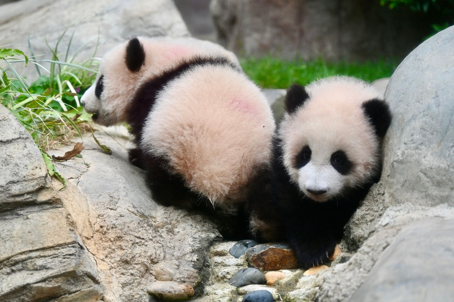 大熊猫“家姐”(右)与“细佬”(左)玩耍,“细佬”背上有园方为区分幼崽而标注的紫色印记。
