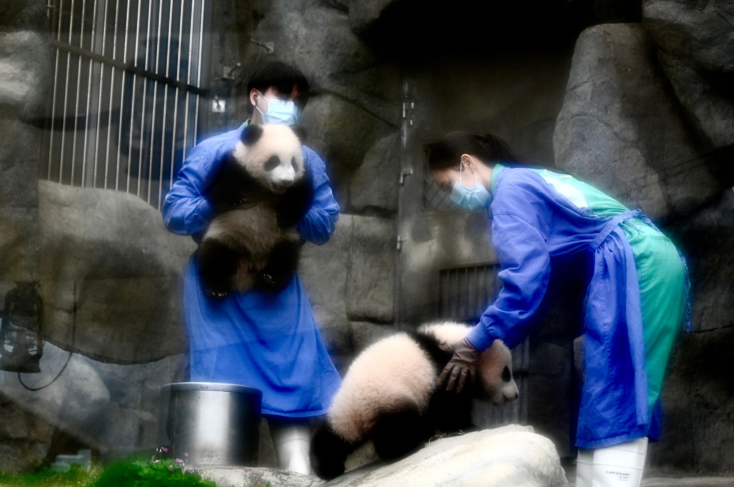 2月15日是“港产”大熊猫龙凤胎的半岁生日,香港将举行“大熊猫龙凤胎宝宝亮相仪式”。图为香港海洋公园护理员抱起大熊猫“细佬”(左)及“家姐”。