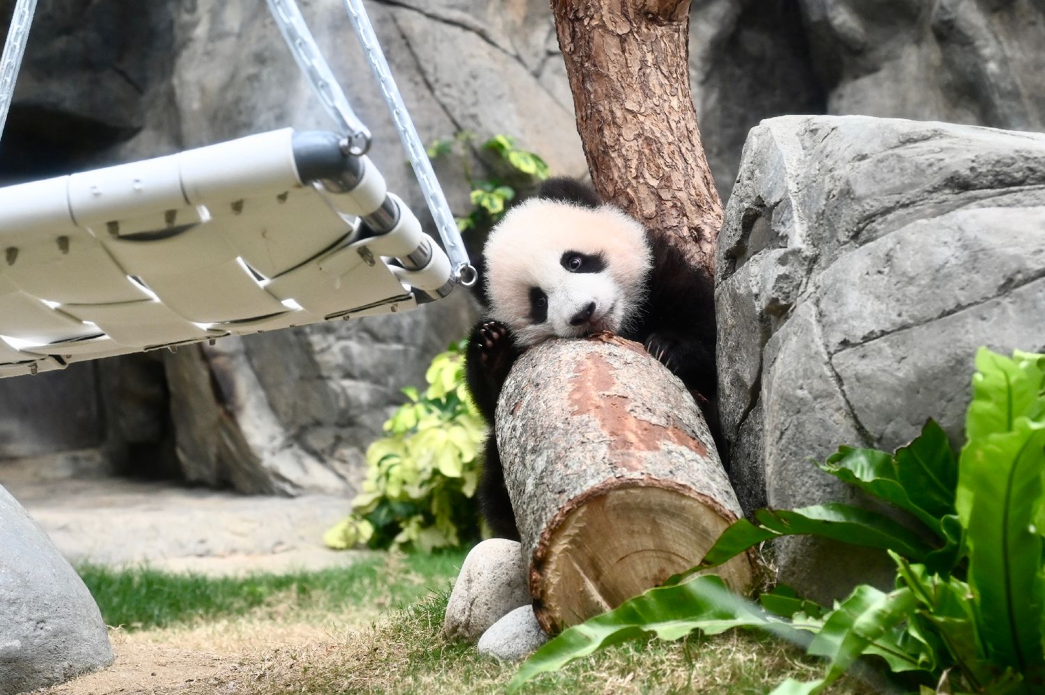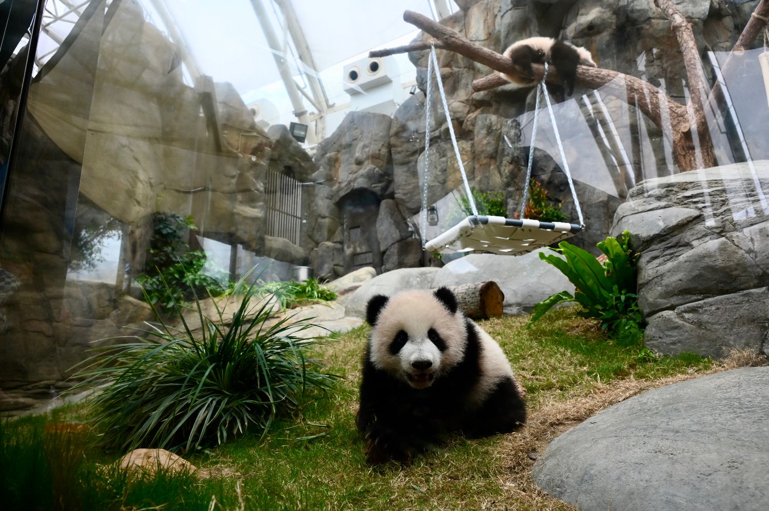 自16日起,公众可在香港海洋公园与两只大熊猫幼崽见面。图为大熊猫“细佬”(前)与在树上睡觉的“家姐”。