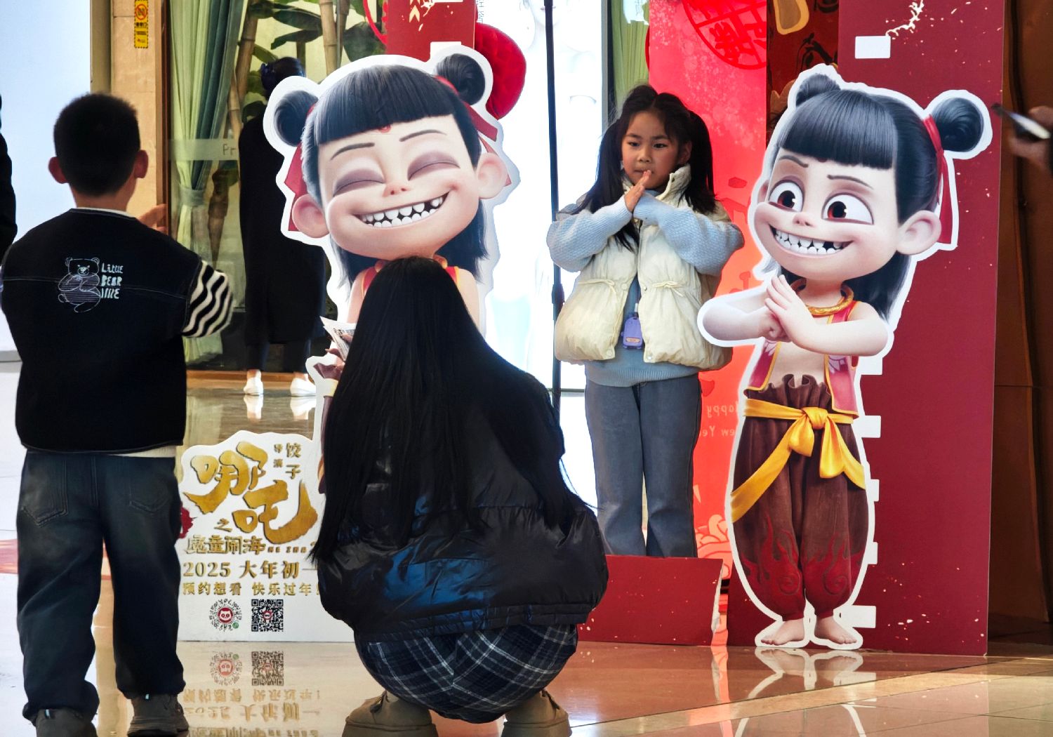 2月6日,福建福州,观众与影城内《哪吒之魔童闹海》电影角色立牌合影。