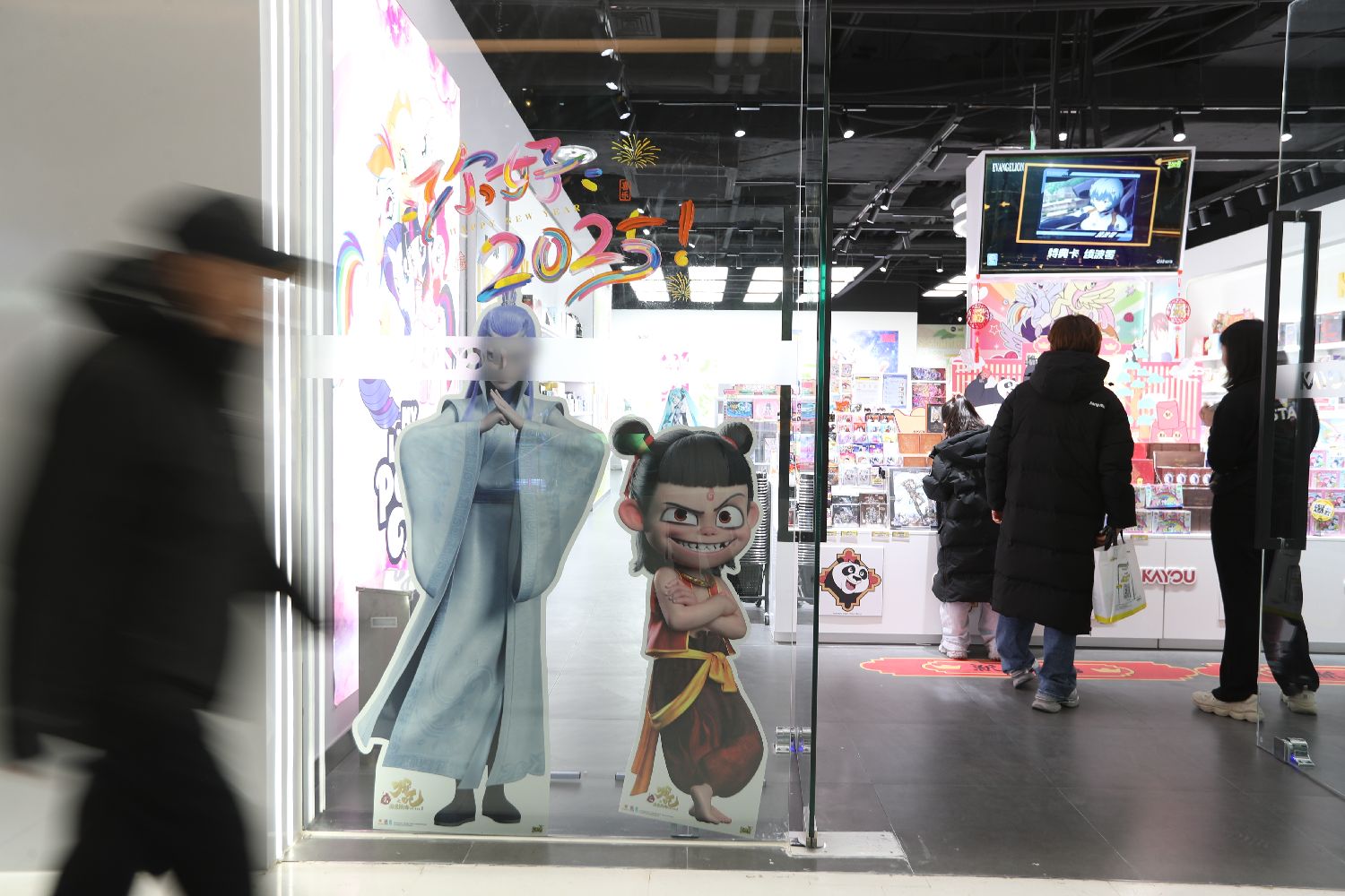 2月6日,民众经过北京一商场内《哪吒之魔童闹海》电影角色立牌。电影相关衍生品已现身北京多家商场。