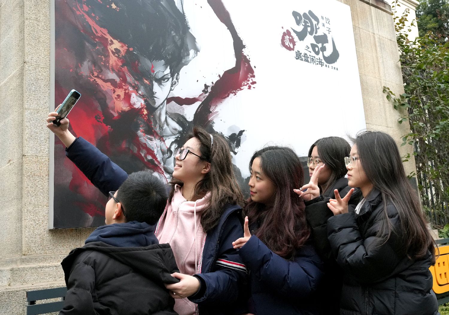 2月6日,四川成都,民众在电影《哪吒之魔童闹海》的制作公司可可豆动画的所在地拍照留念。在成都街头的哪吒雕塑及电影《哪吒之魔童闹海》的制作公司可可豆动画所在地成为了网红打卡点。