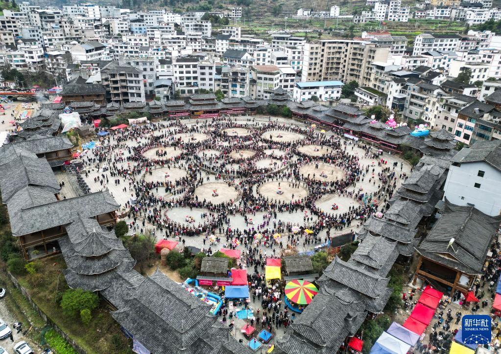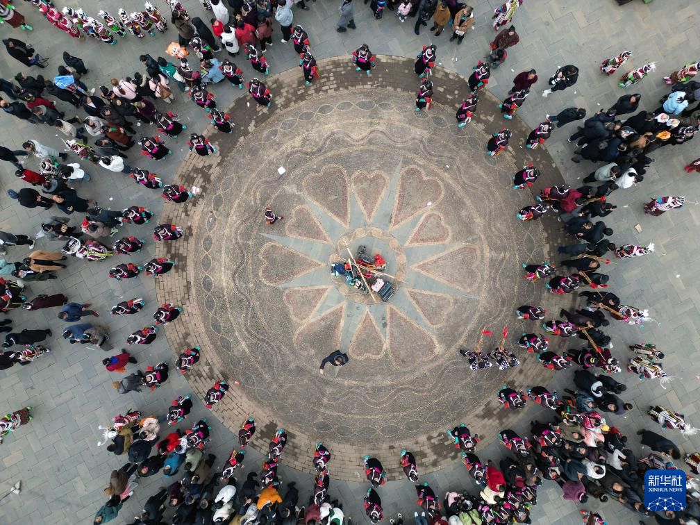 在贵州省凯里市舟溪镇“甘囊香”芦笙堂,人们16日在跳芦笙舞(无人机照片)。