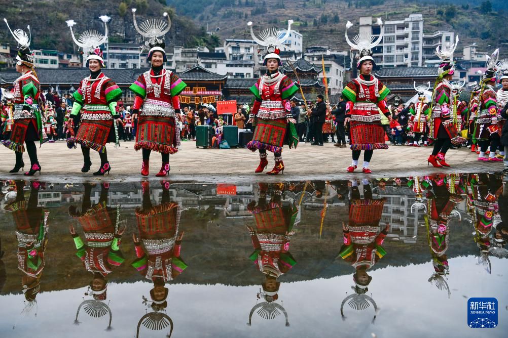 在贵州省凯里市舟溪镇“甘囊香”芦笙堂,苗族姑娘16日身着盛装跳芦笙舞。