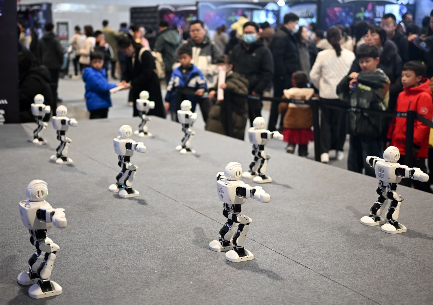 观众16日在AI智能机器人科普展上欣赏“机器人”跳舞。(图片来源:中新社)