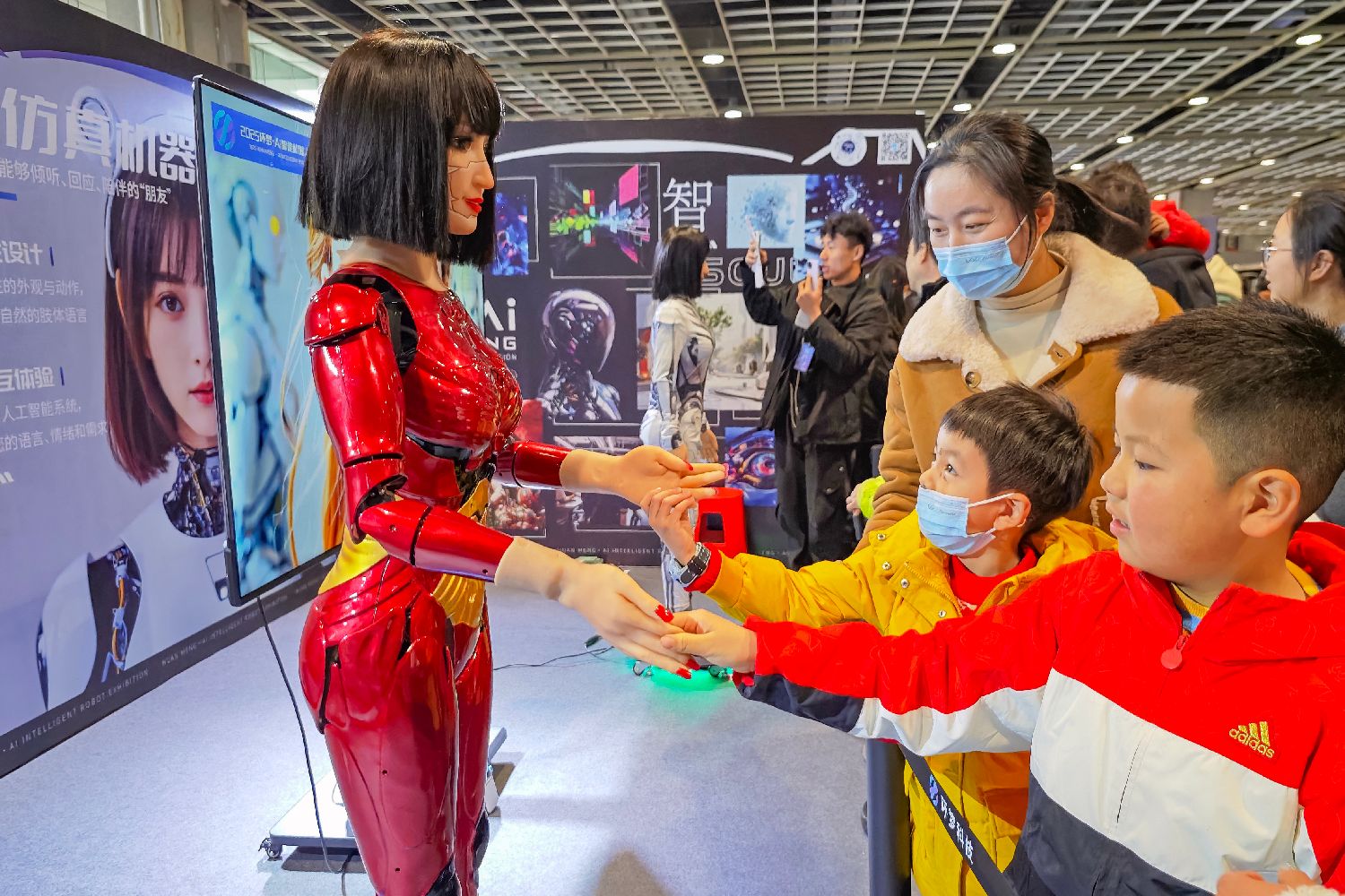 江苏南京观众16日在AI智能机器人科普展上与展示的“机器人”互动。(图片来源:中新社)
