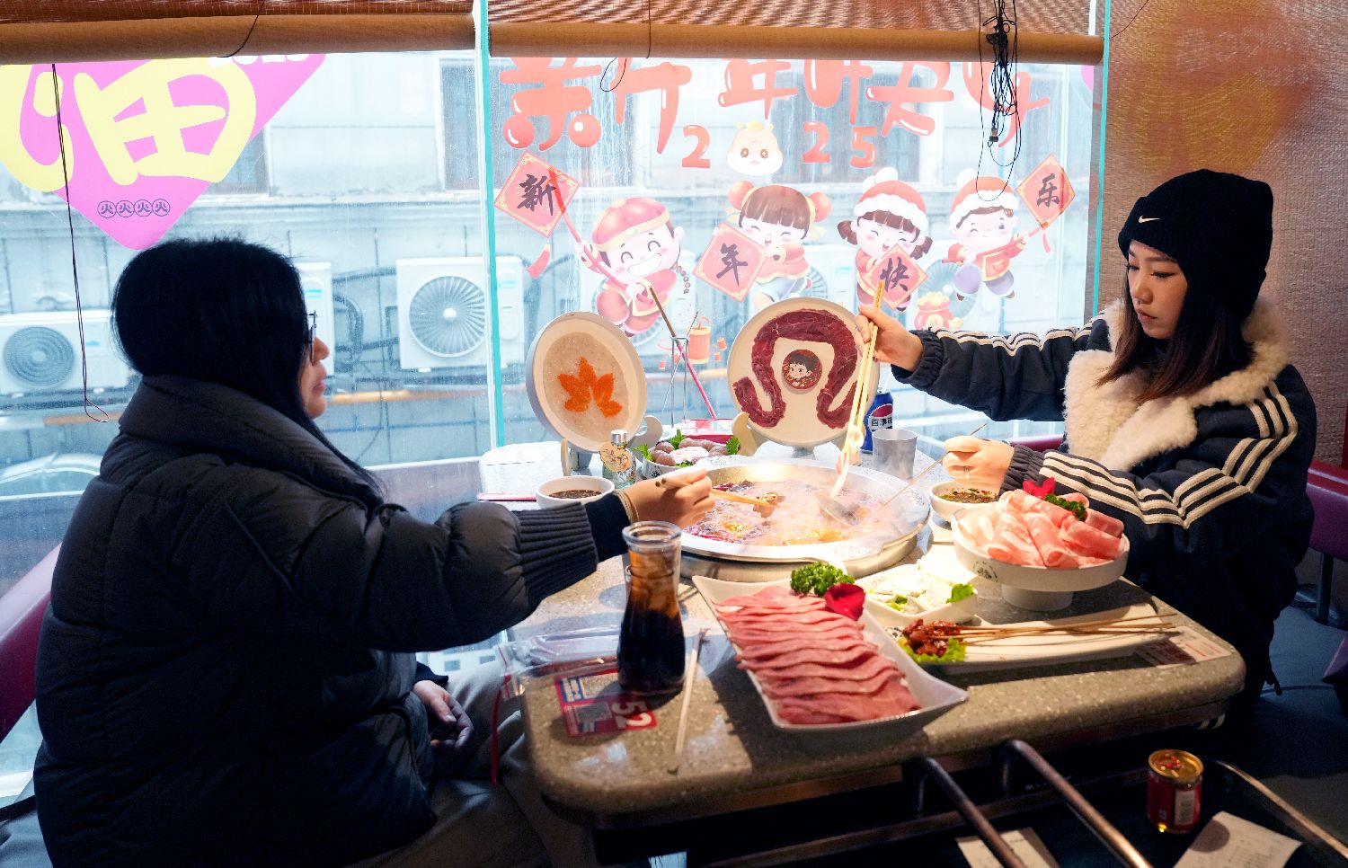 在四川成都,来自福建的游客朱女士(右)一行18日在品尝“哪吒套餐”。