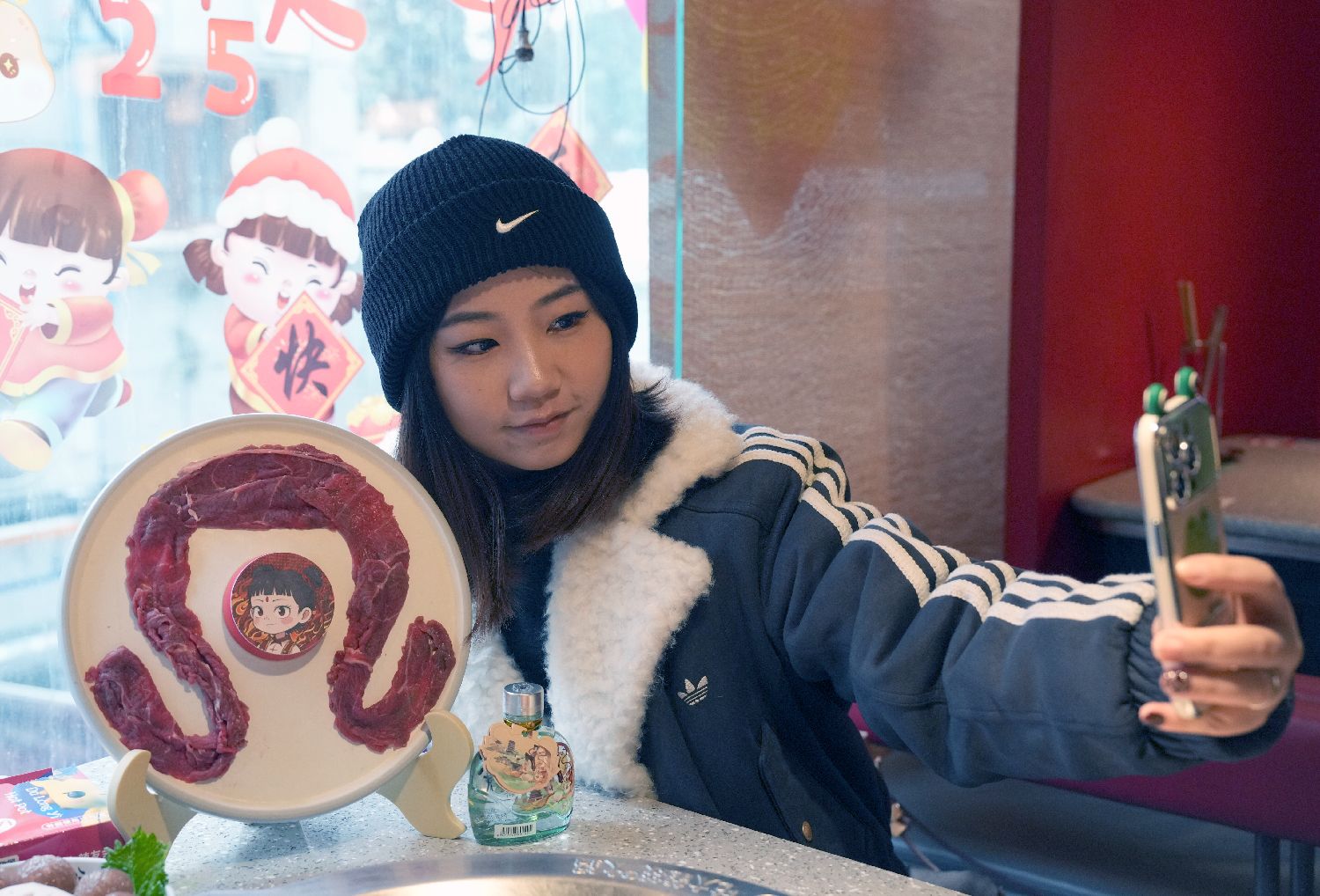 来自福建的游客朱女士与“哪吒套餐”的菜品合影留念。